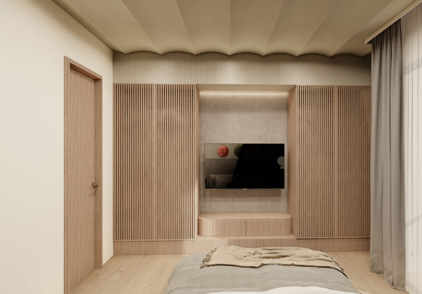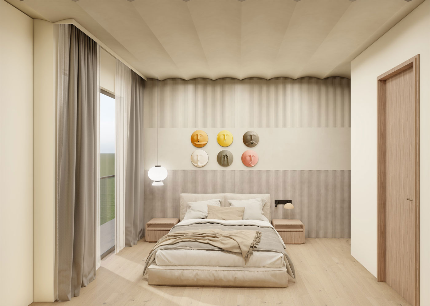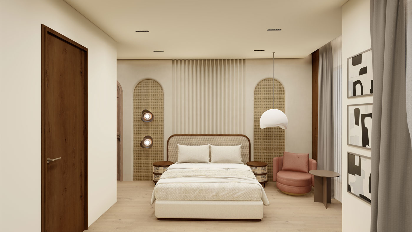 The design plays with curves. Arched doorways, niches and rounded furniture pieces guide the gaze and soften the geometry. Bedrooms feature cane-backed headboards framed within fluted panels, some topped with undulating ceiling treatments that ripple across the room. Colour arrives in deliberate moments: sage green seating, terracotta accents in upholstery, dusty pink in bathroom walls and textiles. The base throughout stays neutral, blonde wood floors and cream walls. Bathrooms mix vertical white tiles on lower walls with warm paint above, geometric floor patterns adding highlights.