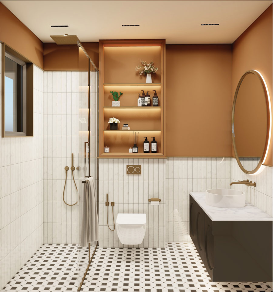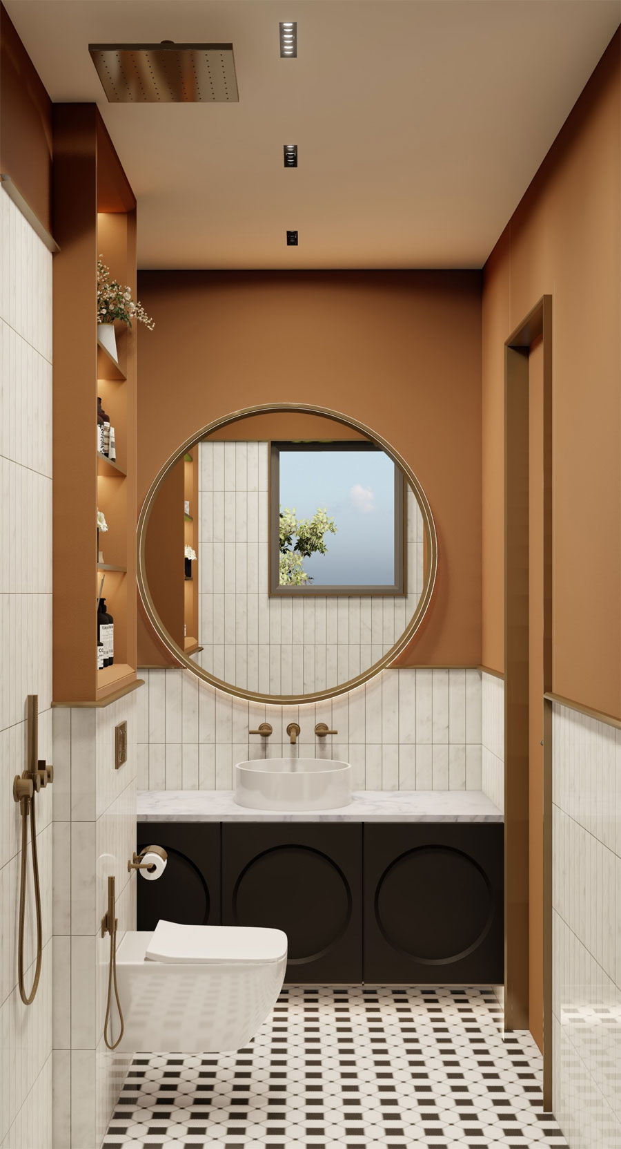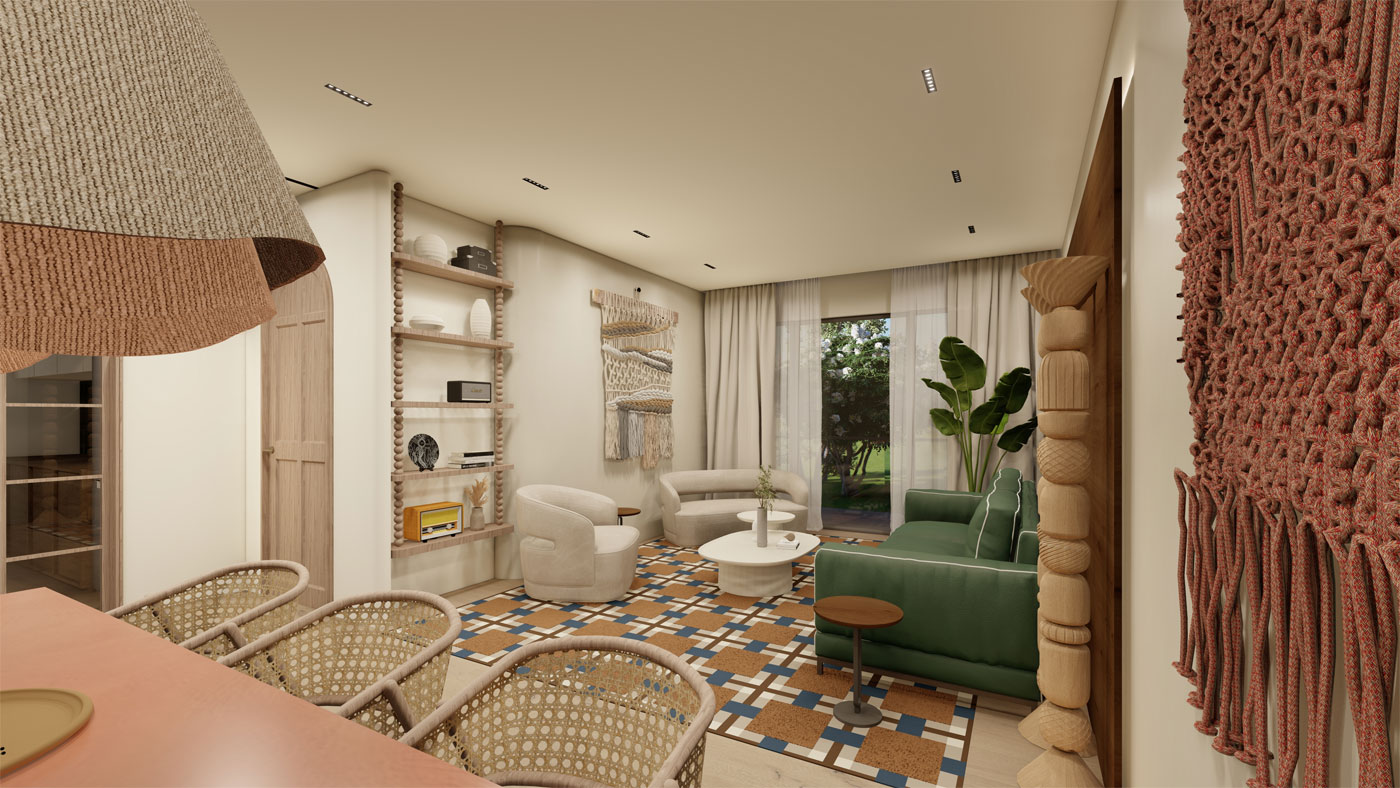 The design plays with curves. Arched doorways, niches and rounded furniture pieces guide the gaze and soften the geometry. Bedrooms feature cane-backed headboards framed within fluted panels, some topped with undulating ceiling treatments that ripple across the room. Colour arrives in deliberate moments: sage green seating, terracotta accents in upholstery, dusty pink in bathroom walls and textiles. The base throughout stays neutral, blonde wood floors and cream walls. Bathrooms mix vertical white tiles on lower walls with warm paint above, geometric floor patterns adding highlights.
