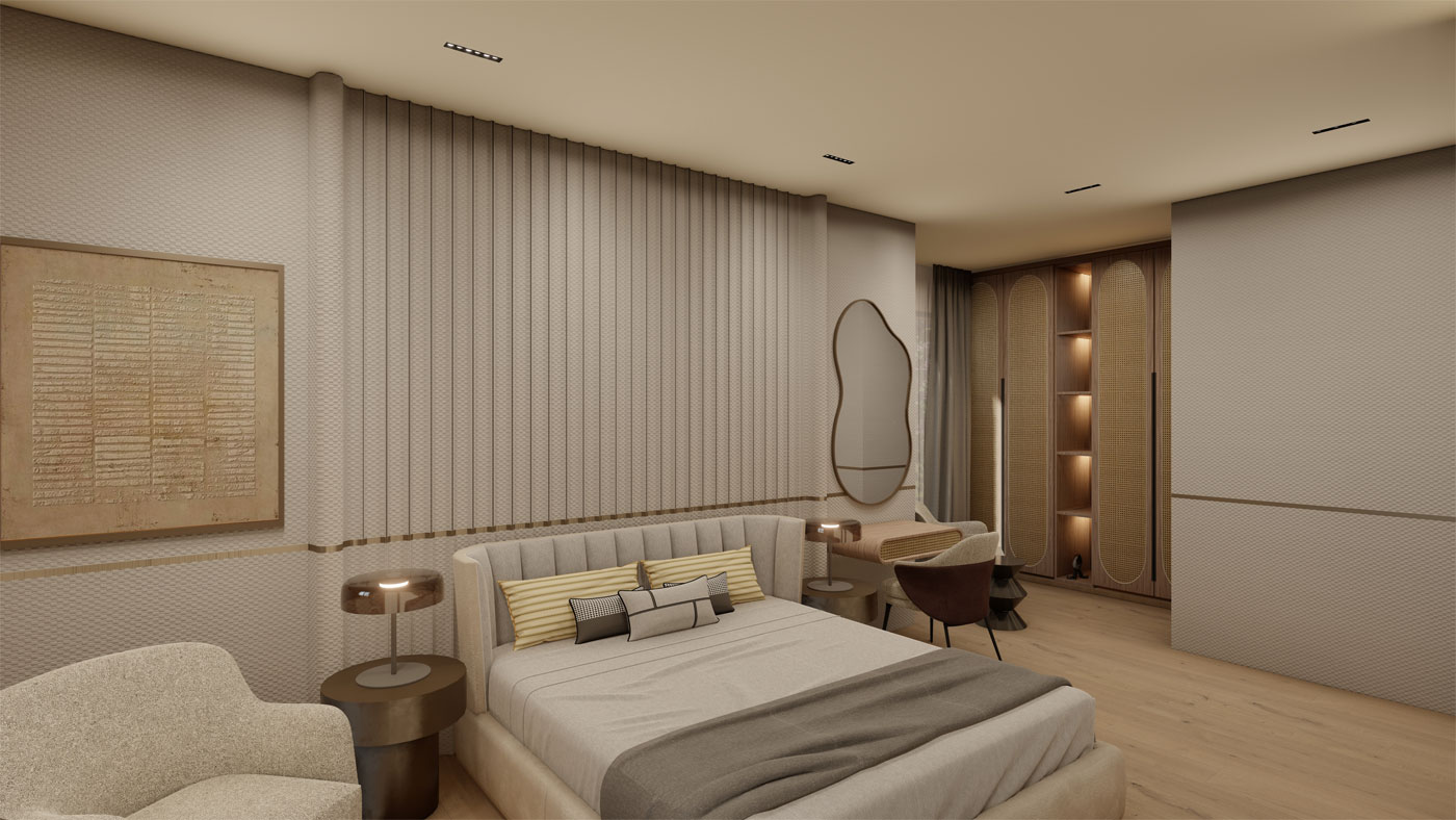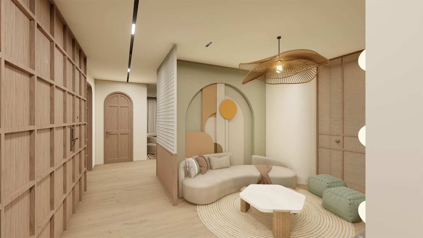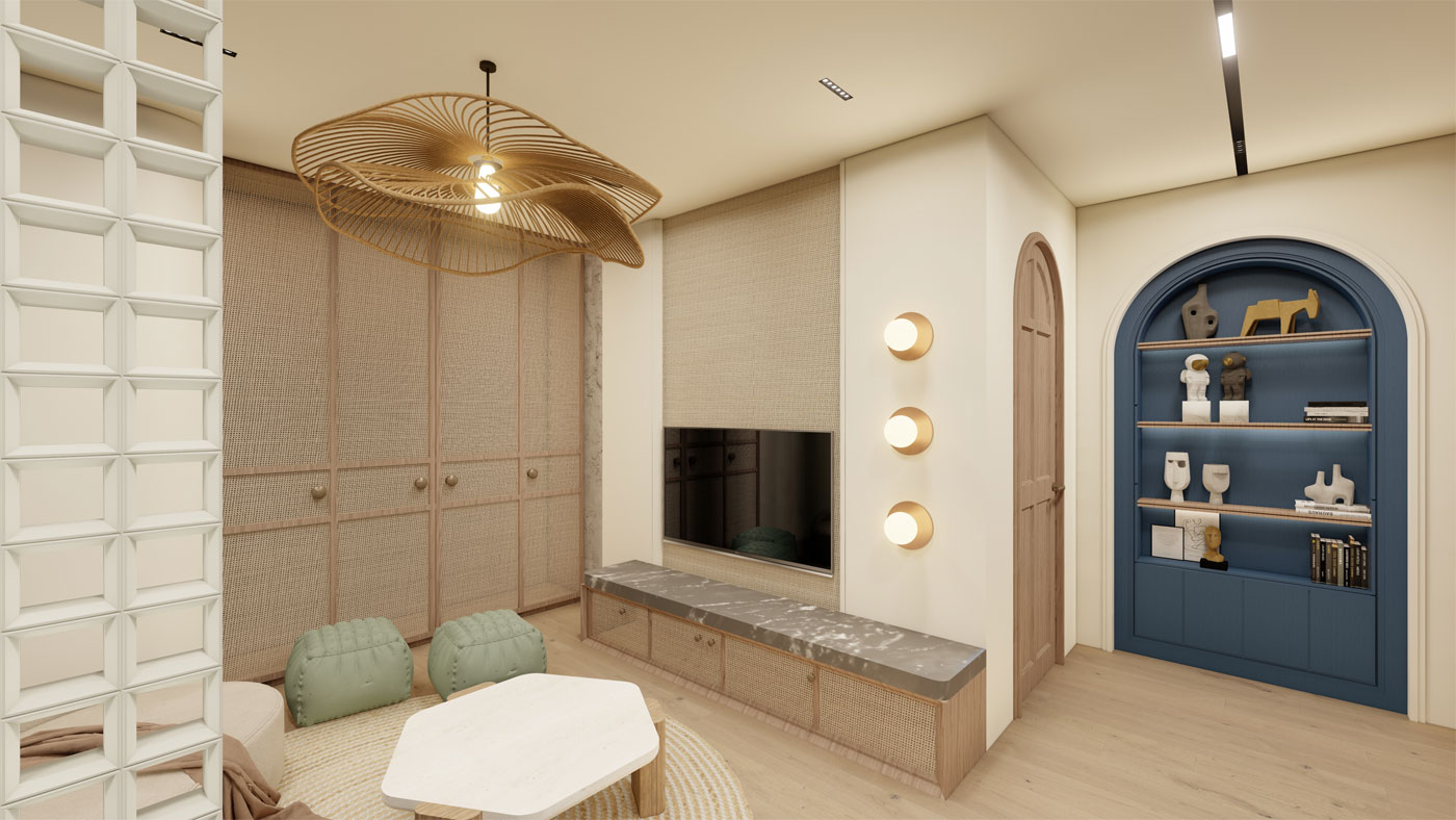 Soft earth tones, natural textures and gentle curves define this apartment, a home that feels calm the moment you step inside. Cane weaving appears throughout, from cabinet fronts and headboards to room dividers and arched alcoves, adding subtle rhythm and shadow that give each space personality without cluttering it.