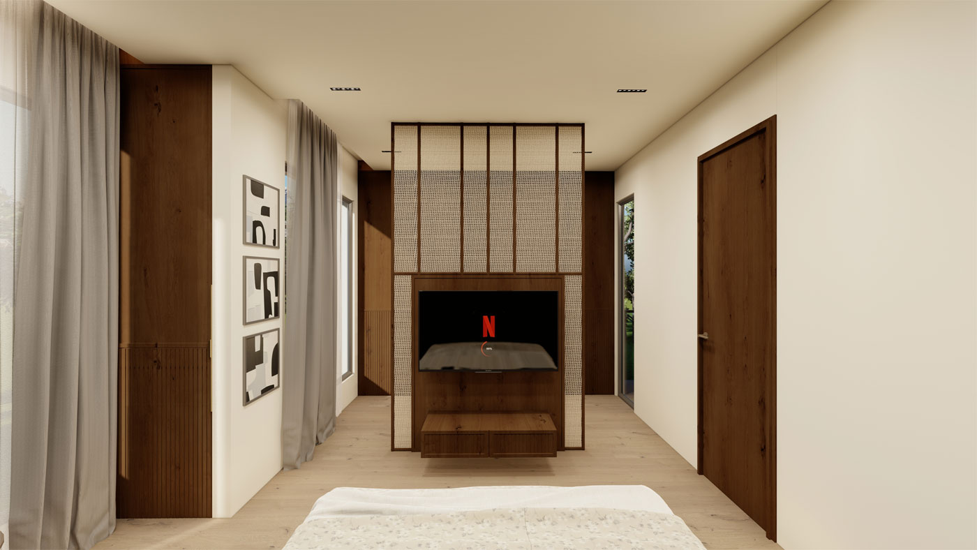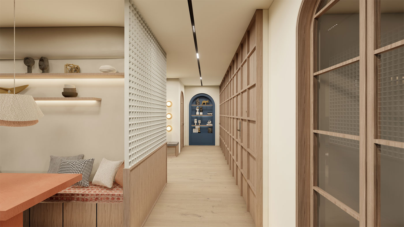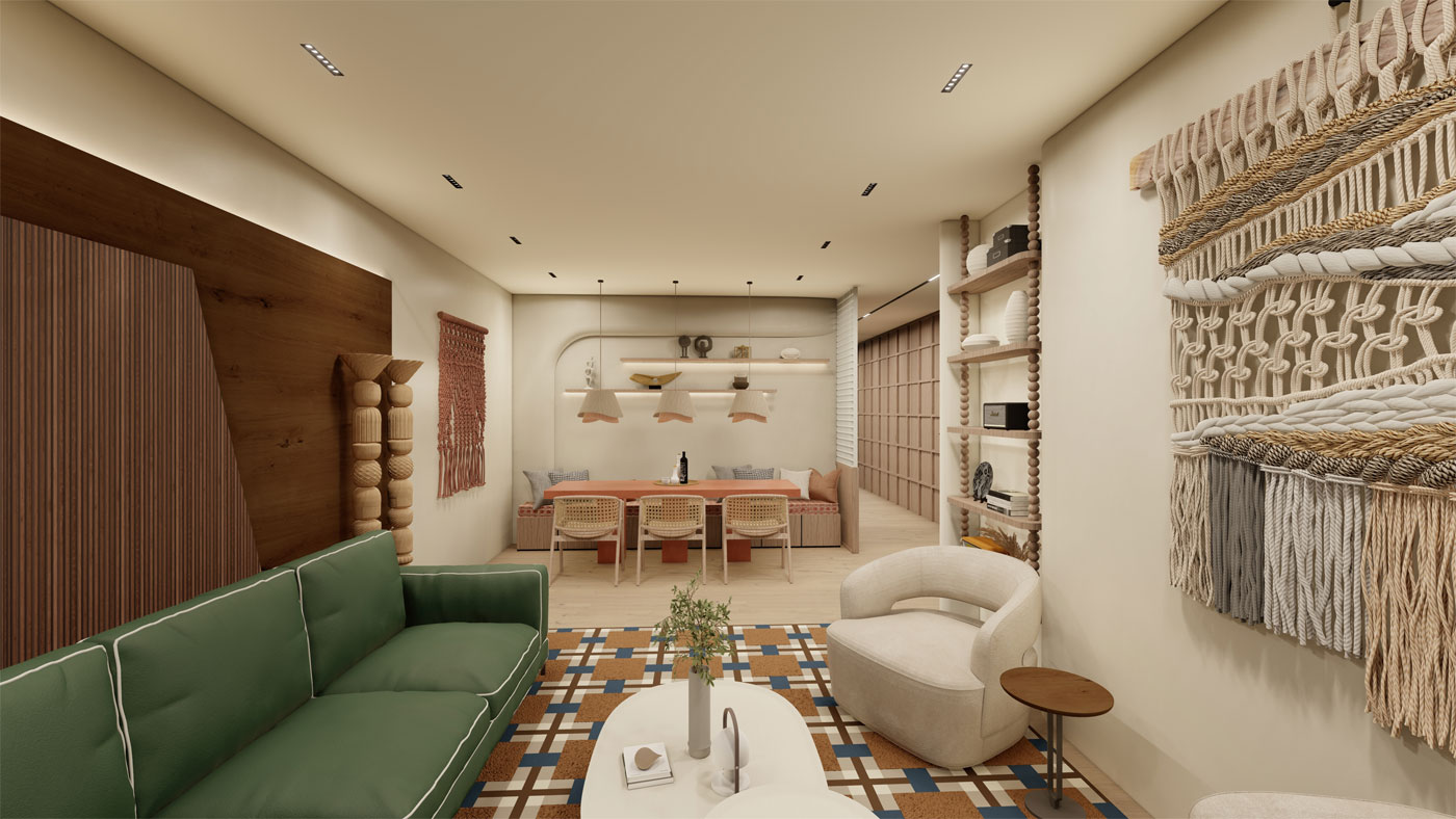 Soft earth tones, natural textures and gentle curves define this apartment, a home that feels calm the moment you step inside. Cane weaving appears throughout, from cabinet fronts and headboards to room dividers and arched alcoves, adding subtle rhythm and shadow that give each space personality without cluttering it.
