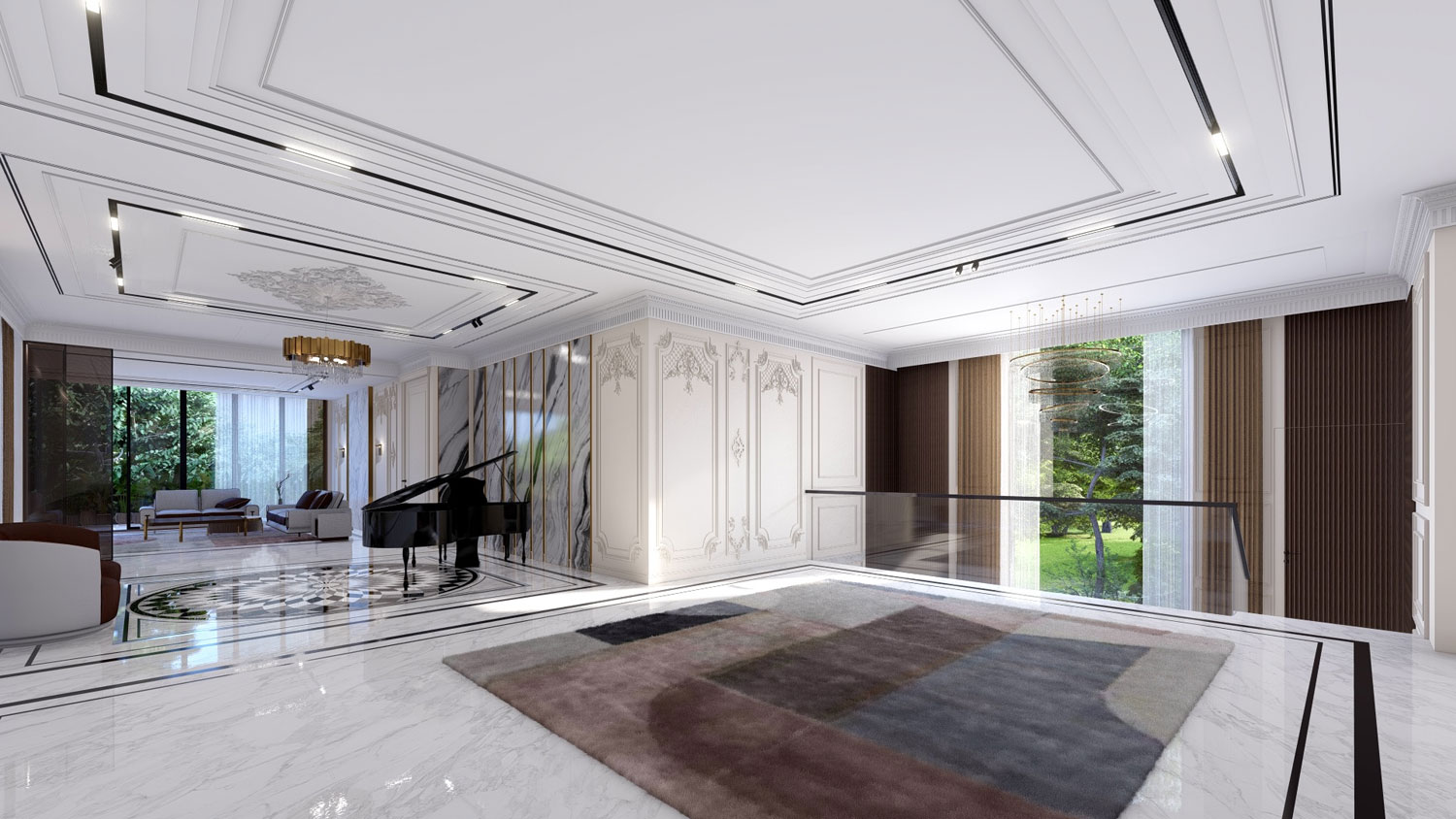 Natural light softens the grandeur, streaming through expansive windows to brighten the interiors. It ensures the spaces never feel heavy; instead, the details reveal themselves gradually, in subtle layers, as the day moves. The result is a home committing wholeheartedly to its classical aesthetic while also serving modern family life.