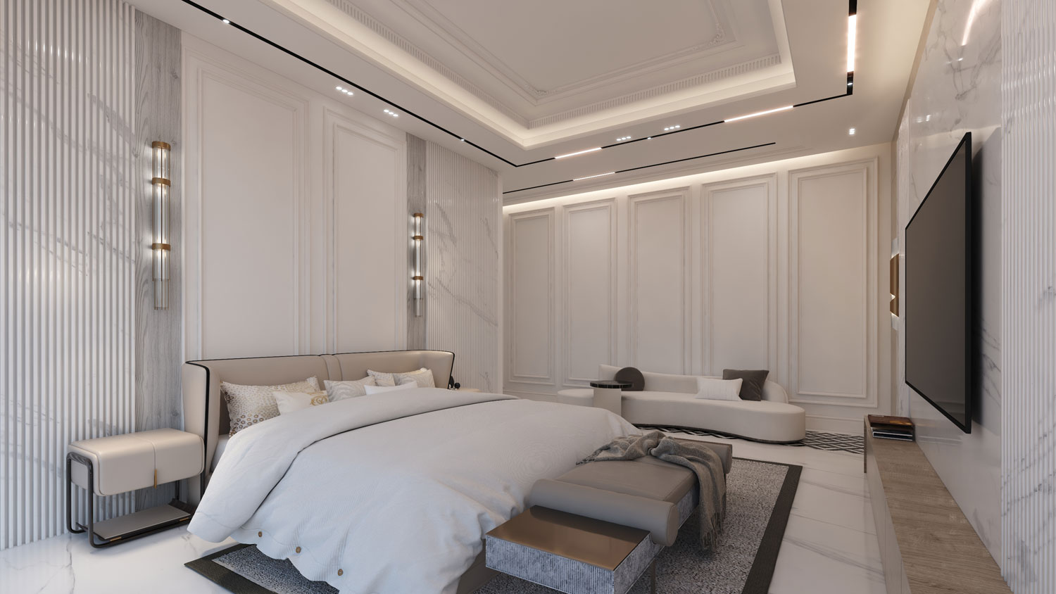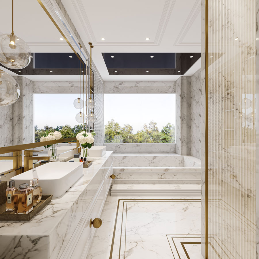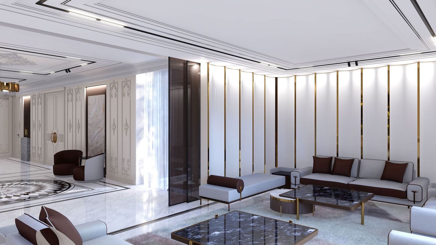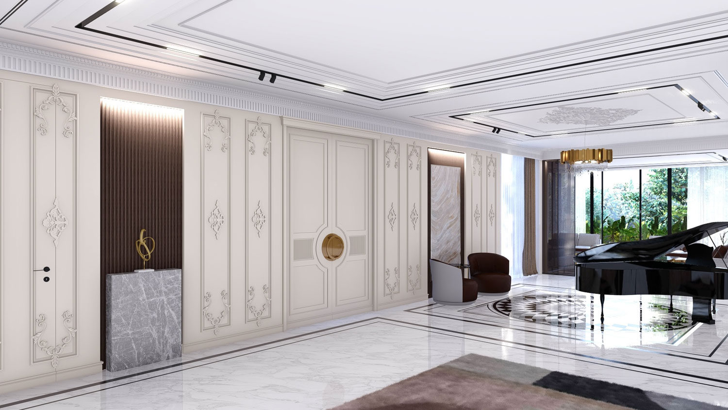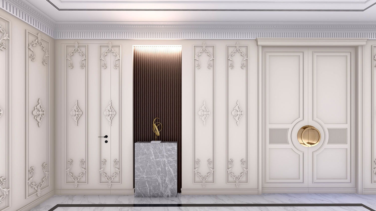 This residence embraces a spirit of delicate maximalism, expressed almost entirely in white yet carried with absolute confidence. Ornate carved panels, intricate ceiling details and a refined mix of marble and brass establish a grand atmosphere throughout.