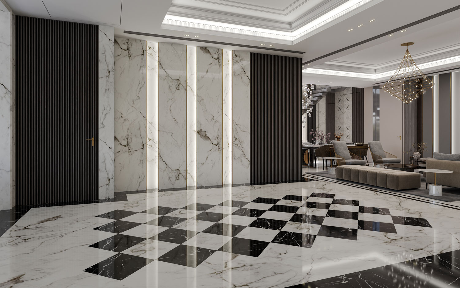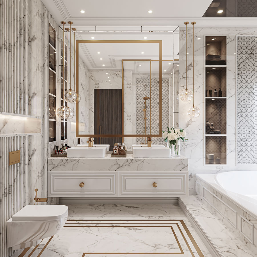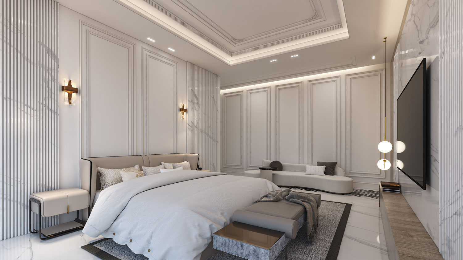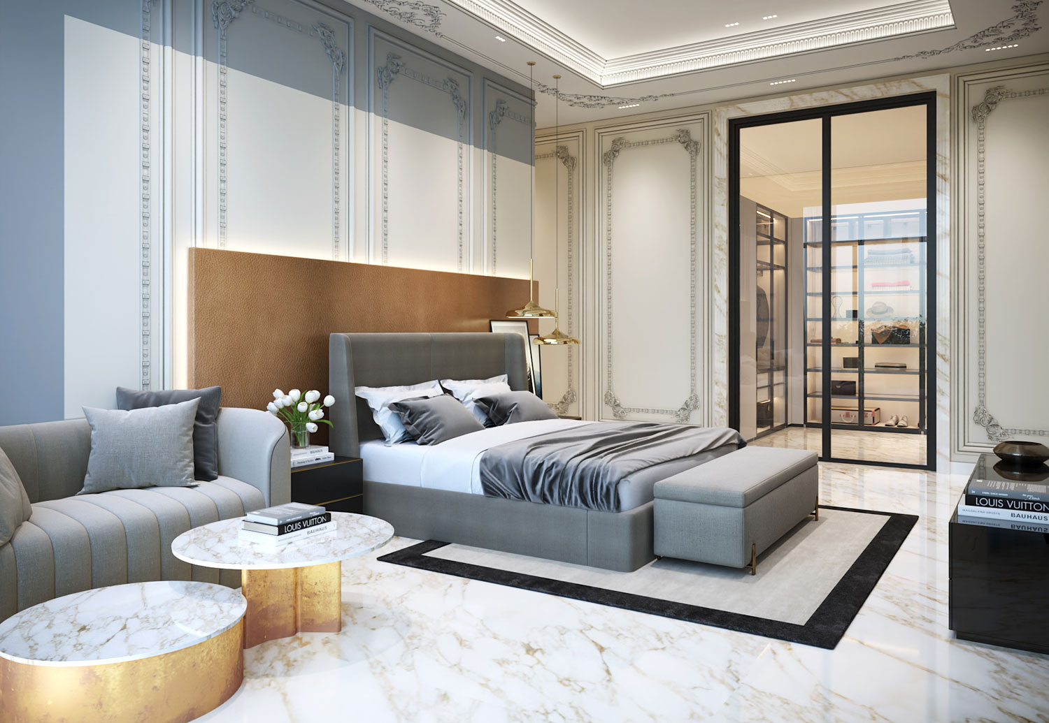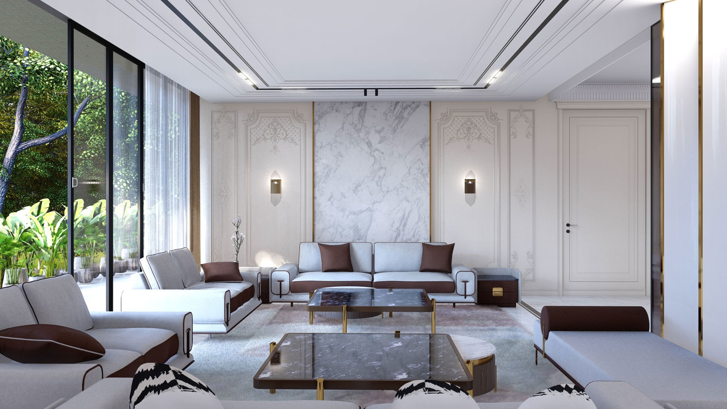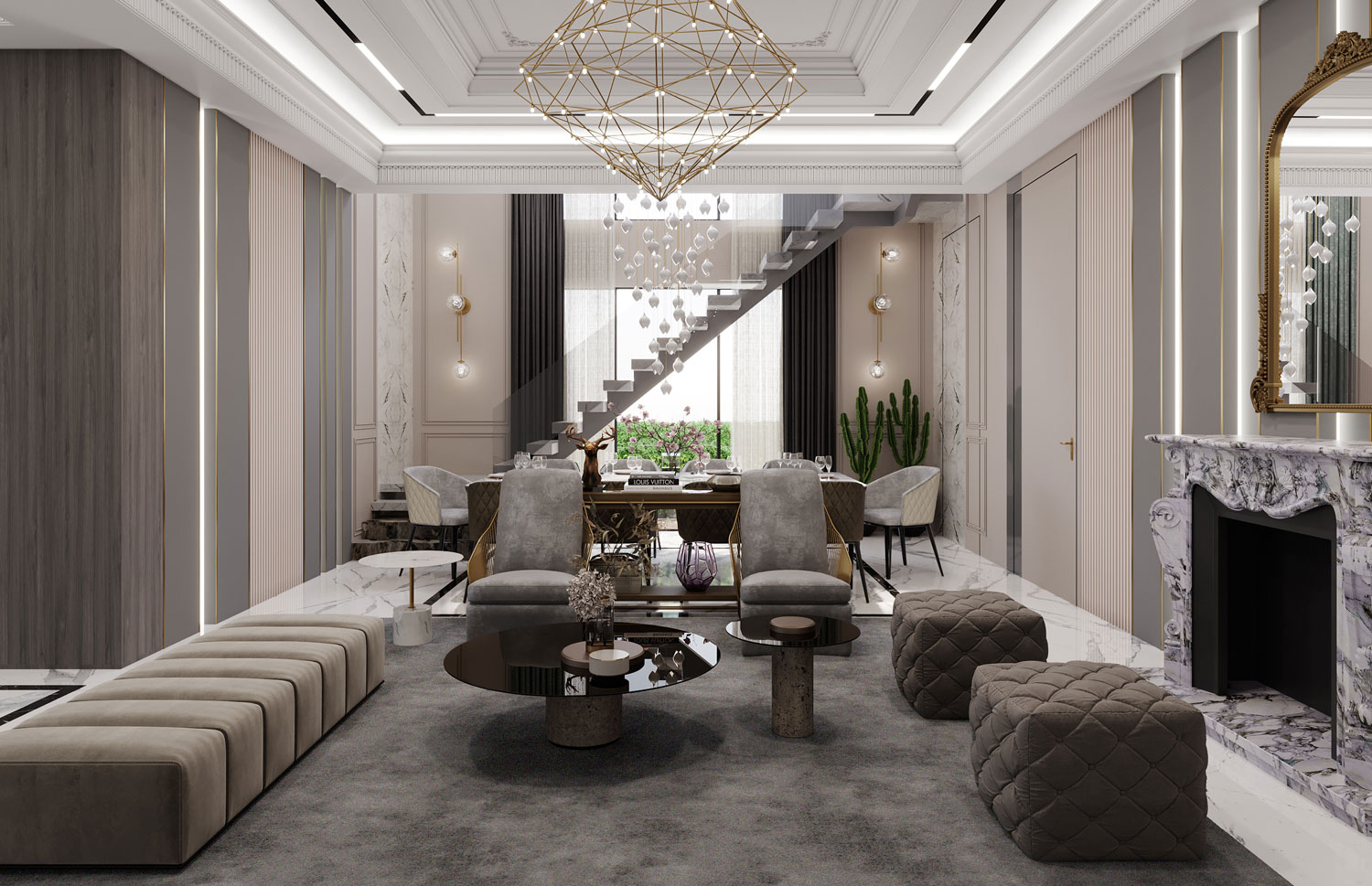 This residence embraces a spirit of delicate maximalism, expressed almost entirely in white yet carried with absolute confidence. Ornate carved panels, intricate ceiling details and a refined mix of marble and brass establish a grand atmosphere throughout.