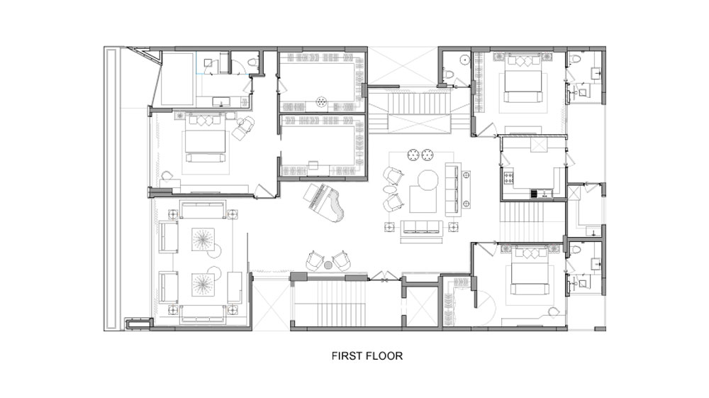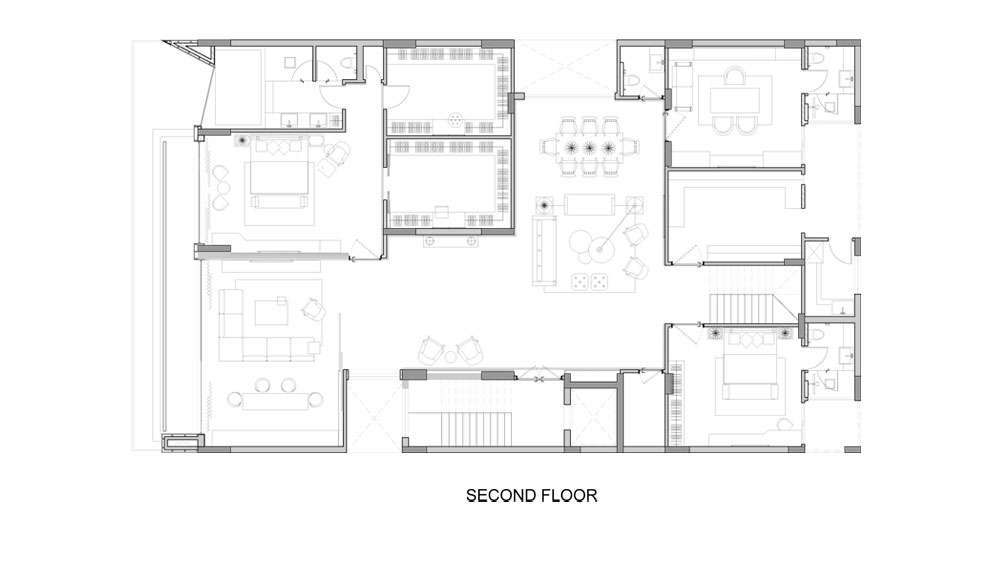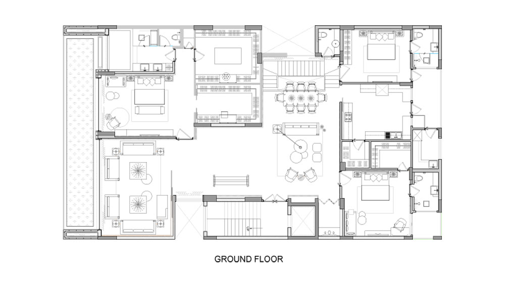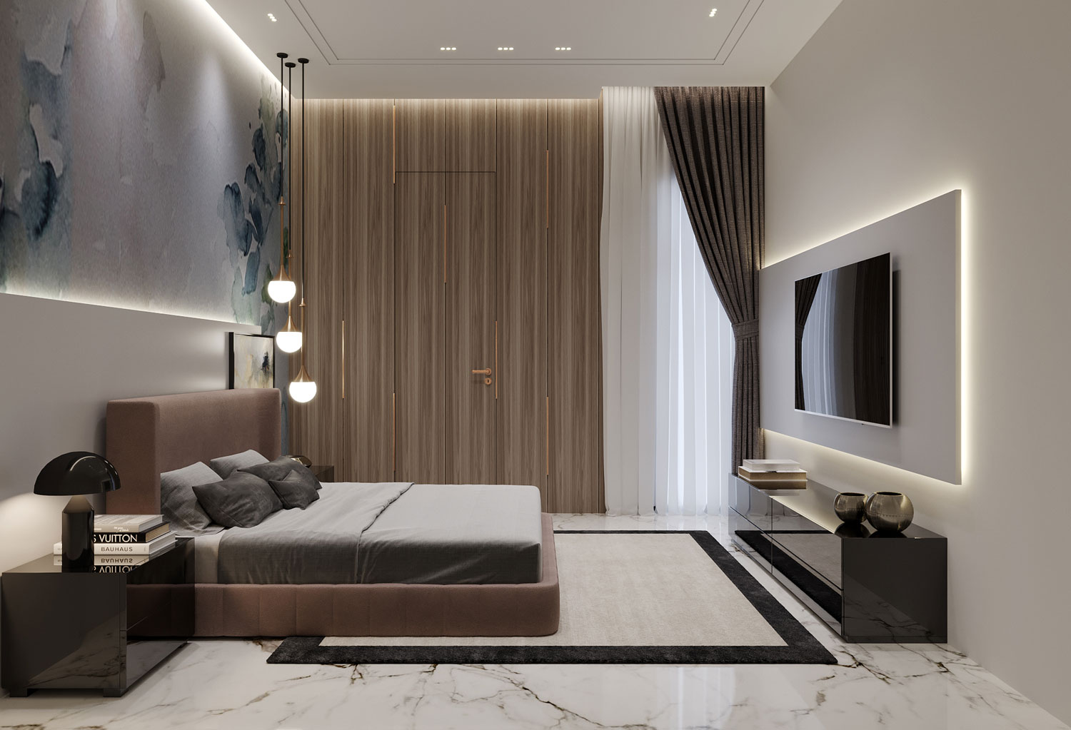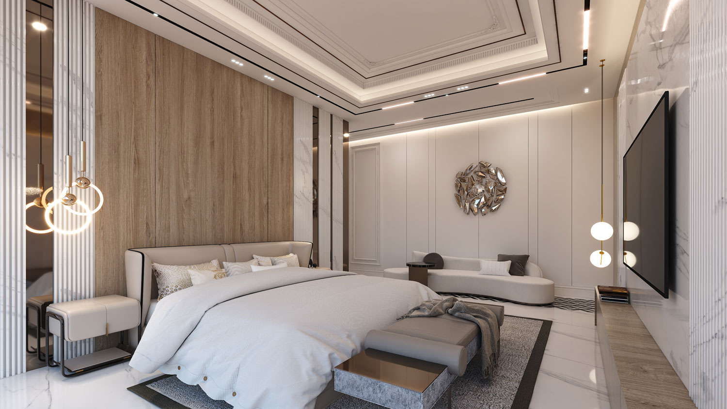 The design celebrates craftsmanship in every corner and detail. Hand-carved wall panels showcase traditional artisan work, while the extensive use of marble and brass heighten the sense of order and richness. The entrance hall, with its monumental scale and patterned surfaces, sets a stately tone that continues throughout the home. The prayer room holds its own quiet prominence with carved panels and a dedicated altar, while bedrooms, bathrooms and other private areas extend the home’s classical language in more intimate and functional forms.