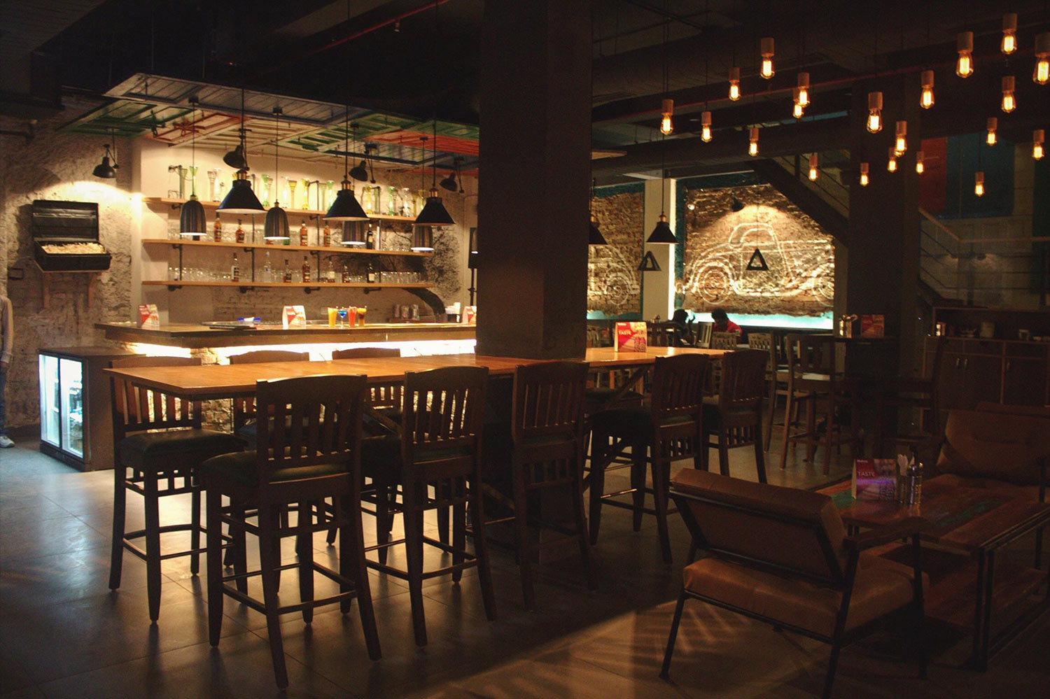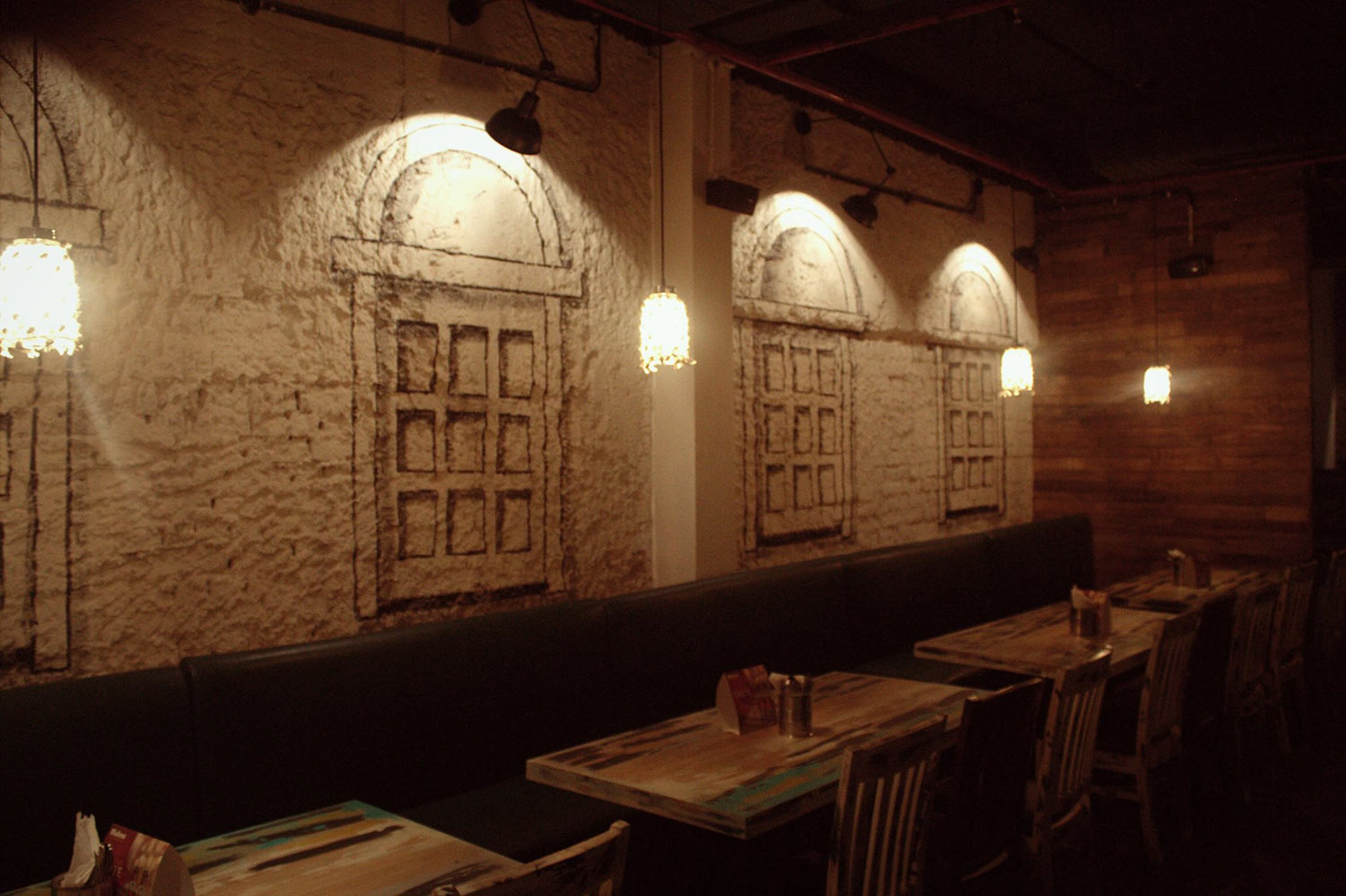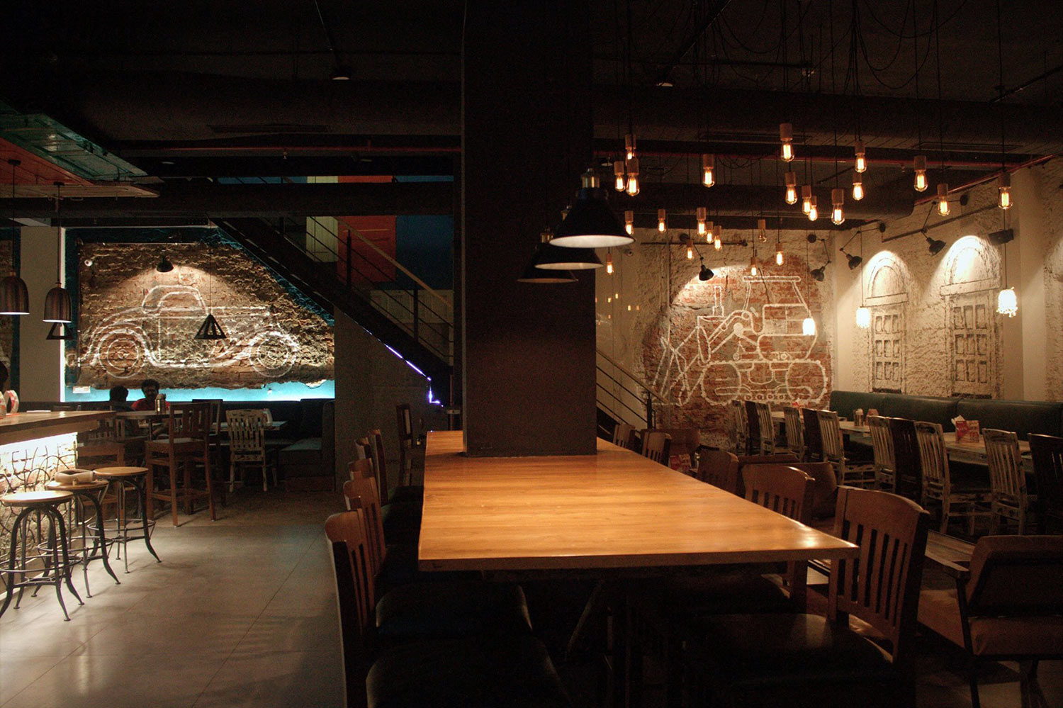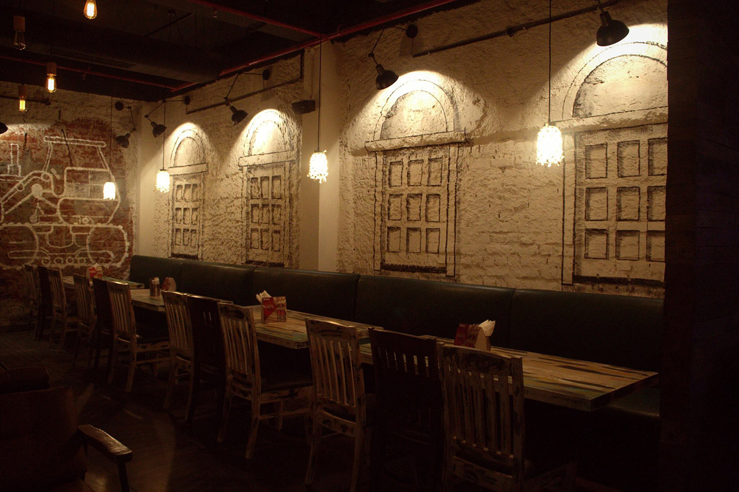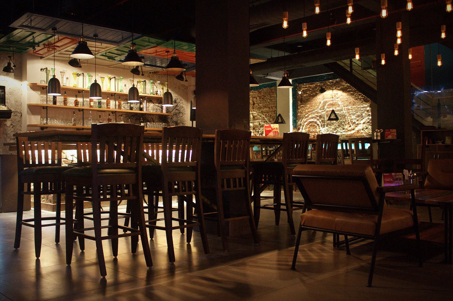 The design of this lounge demonstrates how restraint can be a compelling creative gesture. The space leverages its rustic setting and adds lighting to create an atmospheric dining environment that balances raw materiality with warmth. Exposed brick walls are left in their weathered state with dramatic uplighting that highlights hand-painted murals in white. These graphic elements are a direct reference to India’s unfiltered street culture. Exposing all structural elements, the ceiling creates a sense of depth and shadow above. Vintage style bulbs hover at varying heights adding a mysterious ambient glow. The materials utilized throughout minted to add a sense of tactility and prioritize durability. The bar continues the crude aesthetic as well. Open shelving makes glassware decor elements suited to the function of this space. Simple wooden dining tables pair with spindle-back chairs. The flooring uses large format grey tiles that remain muted and allow the walls and ceiling to dominate.