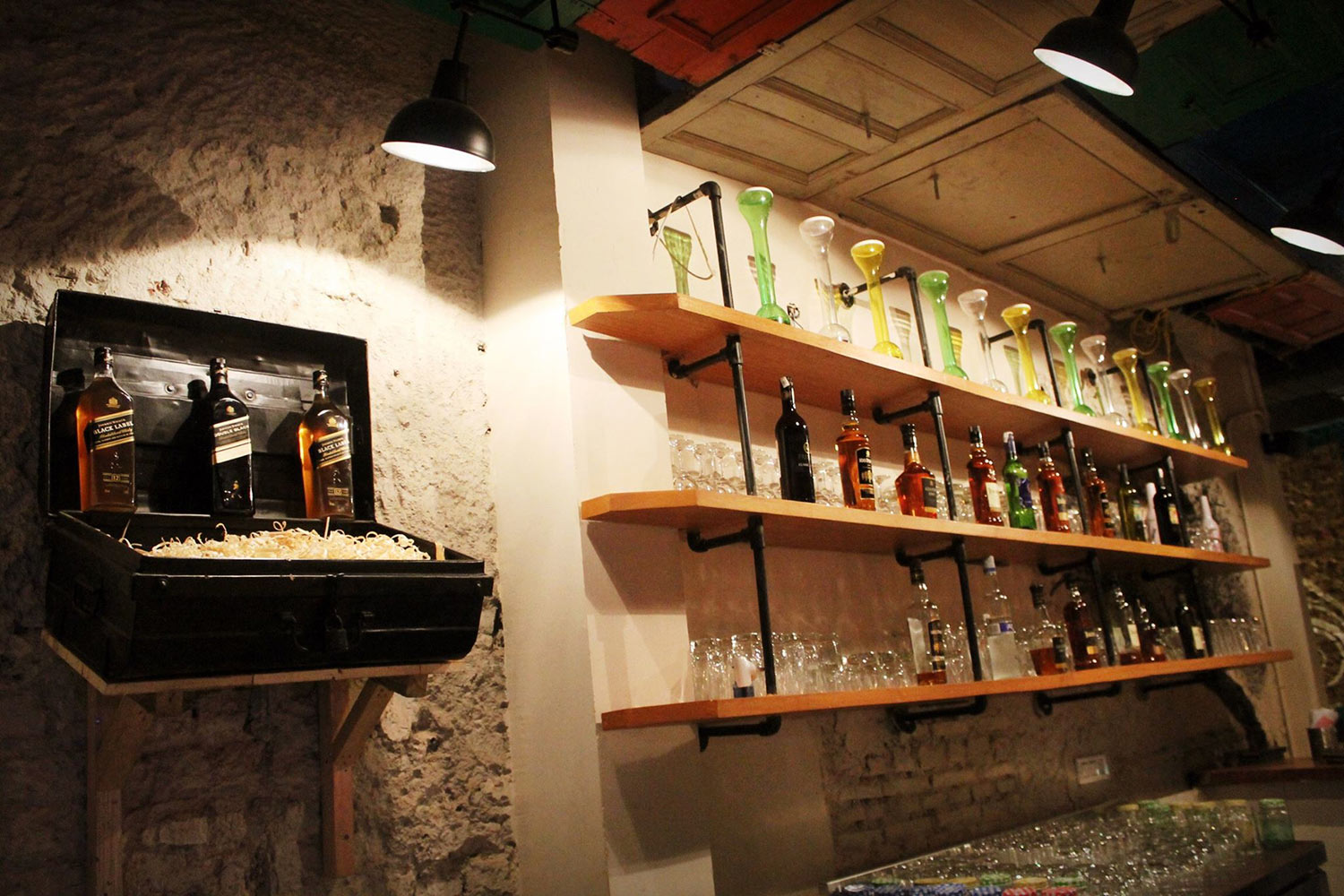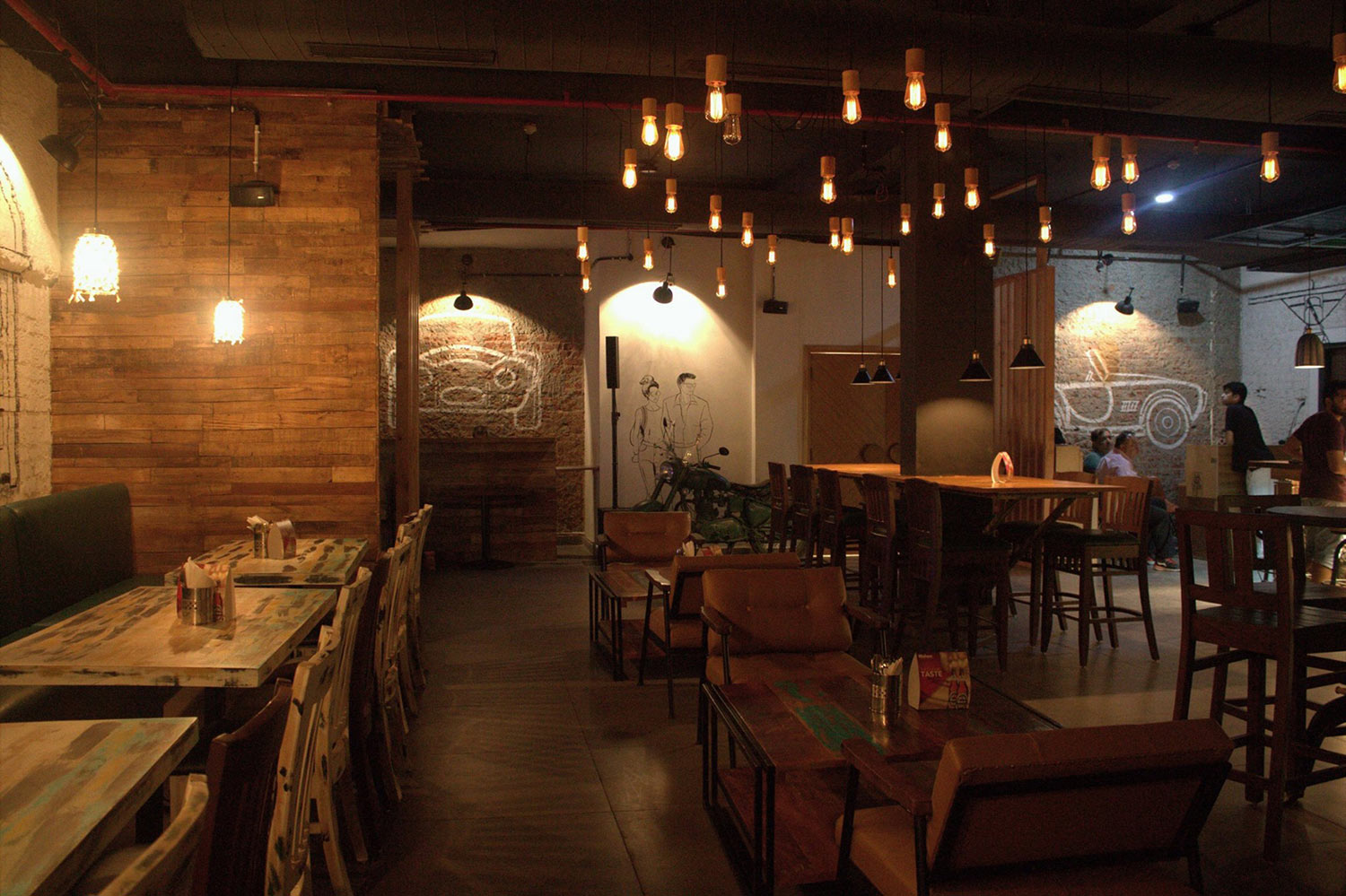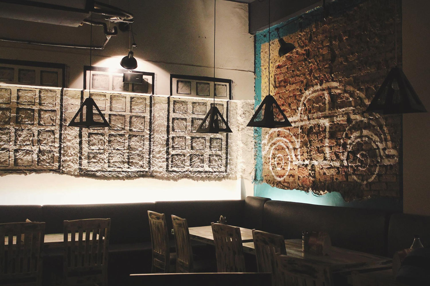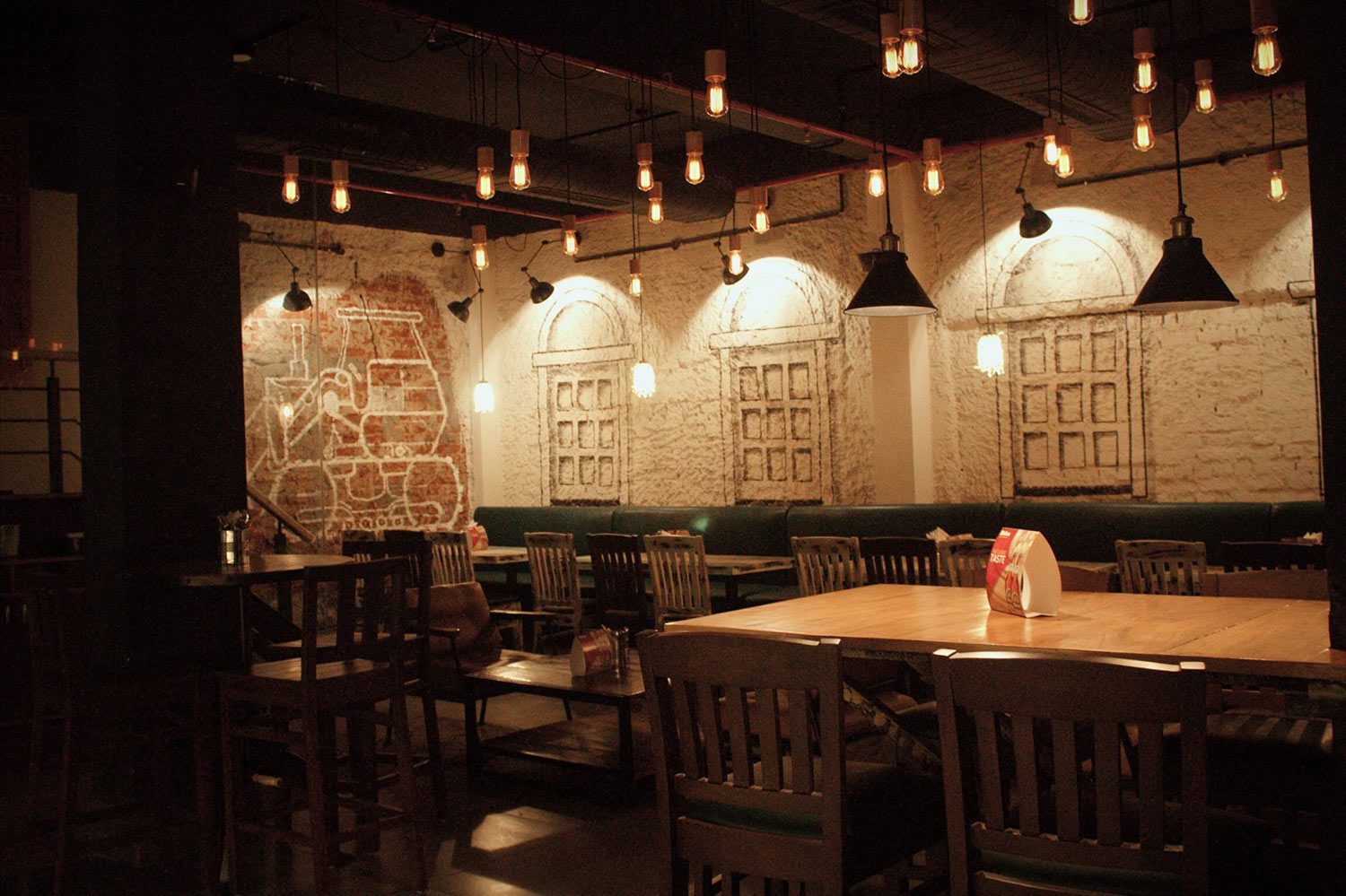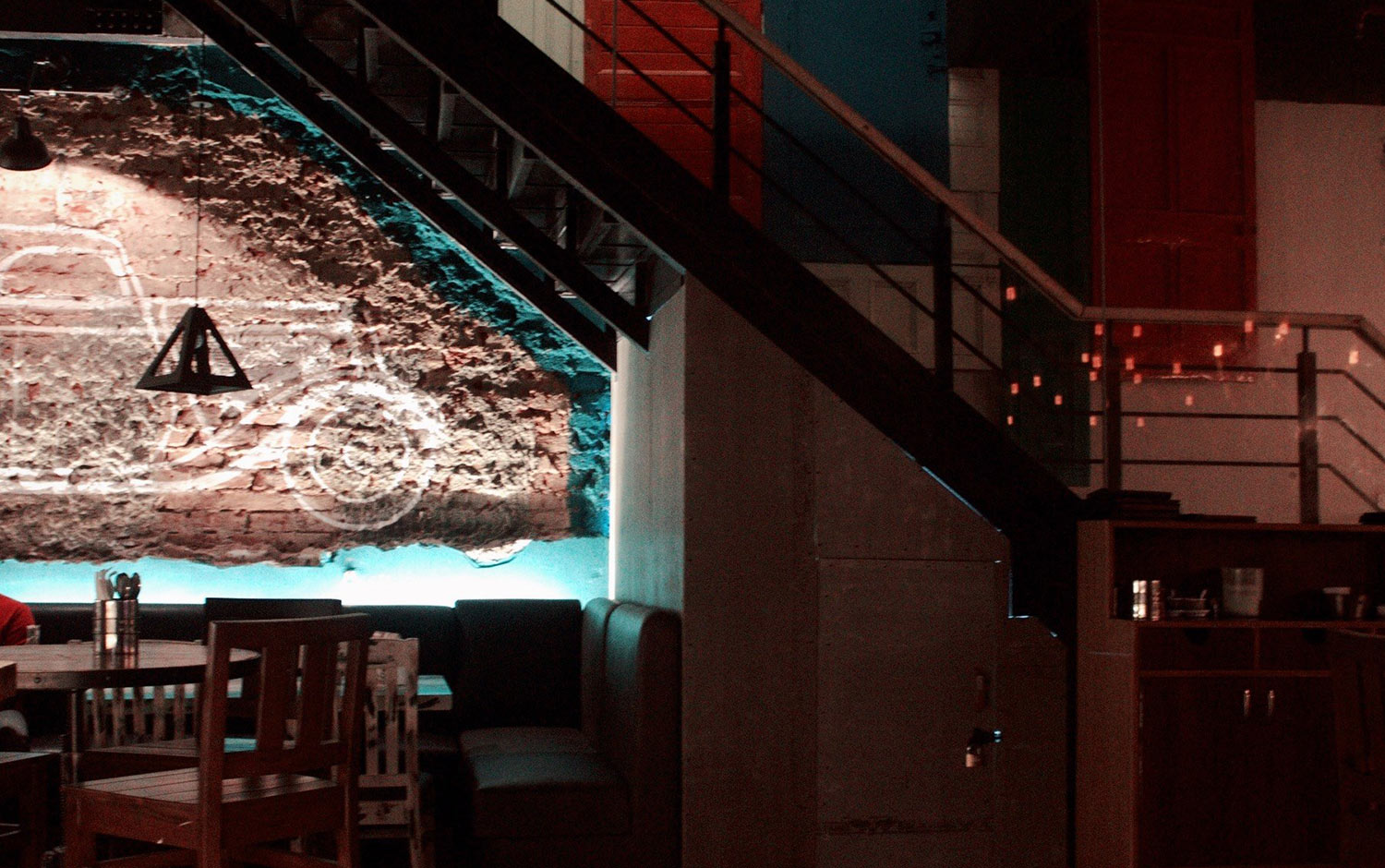 The design of this lounge demonstrates how restraint can be a compelling creative gesture. The space leverages its rustic setting and adds lighting to create an atmospheric dining environment that balances raw materiality with warmth. Exposed brick walls are left in their weathered state with dramatic uplighting that highlights hand-painted murals in white. These graphic elements are a direct reference to India’s unfiltered street culture. Exposing all structural elements, the ceiling creates a sense of depth and shadow above. Vintage style bulbs hover at varying heights adding a mysterious ambient glow. The materials utilized throughout minted to add a sense of tactility and prioritize durability. The bar continues the crude aesthetic as well. Open shelving makes glassware decor elements suited to the function of this space. Simple wooden dining tables pair with spindle-back chairs. The flooring uses large format grey tiles that remain muted and allow the walls and ceiling to dominate.