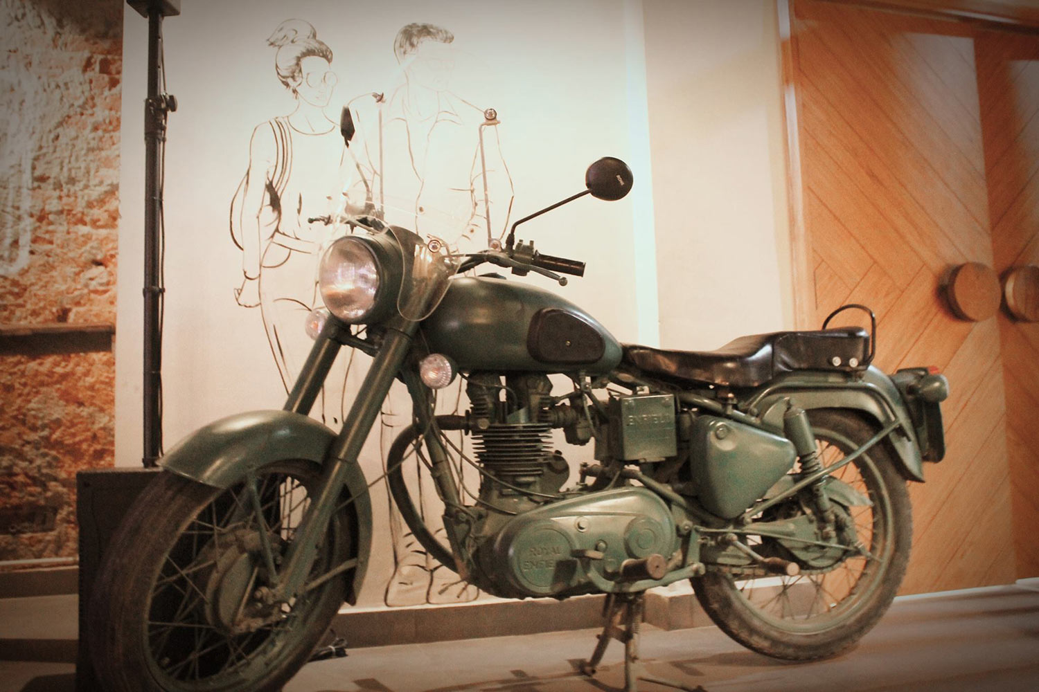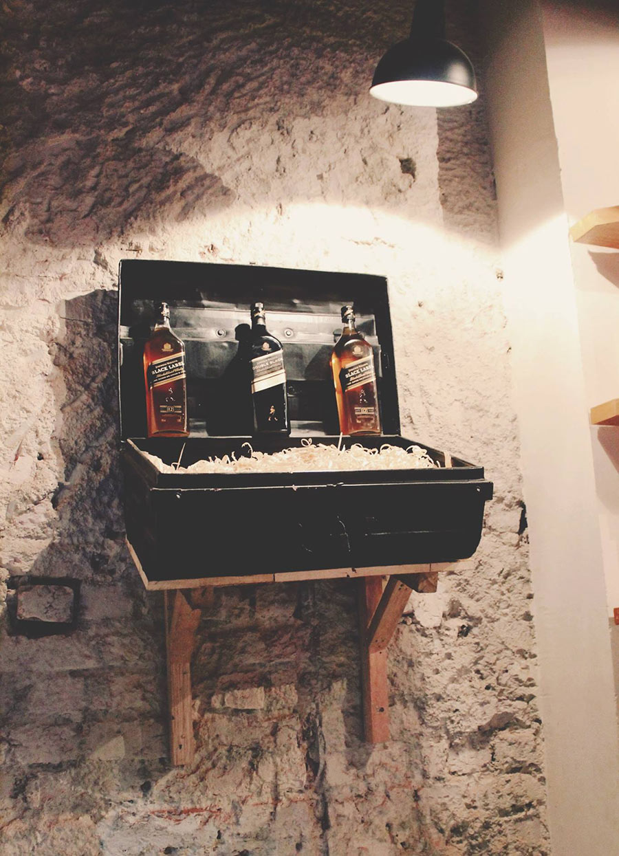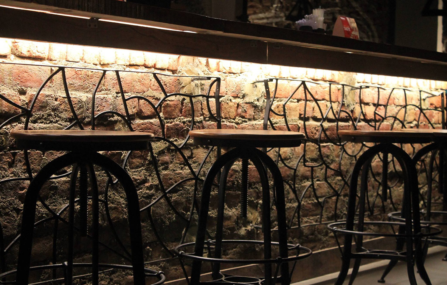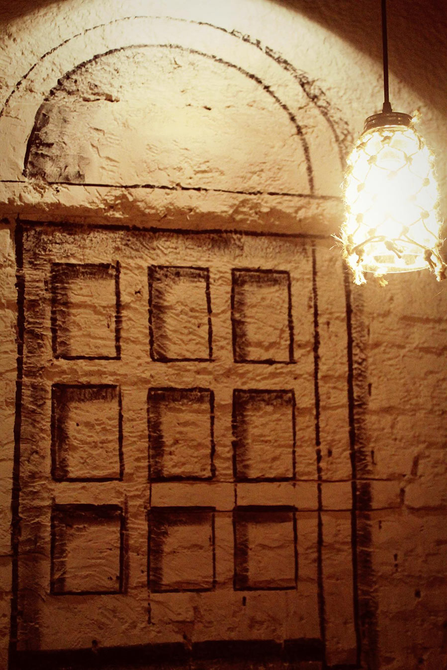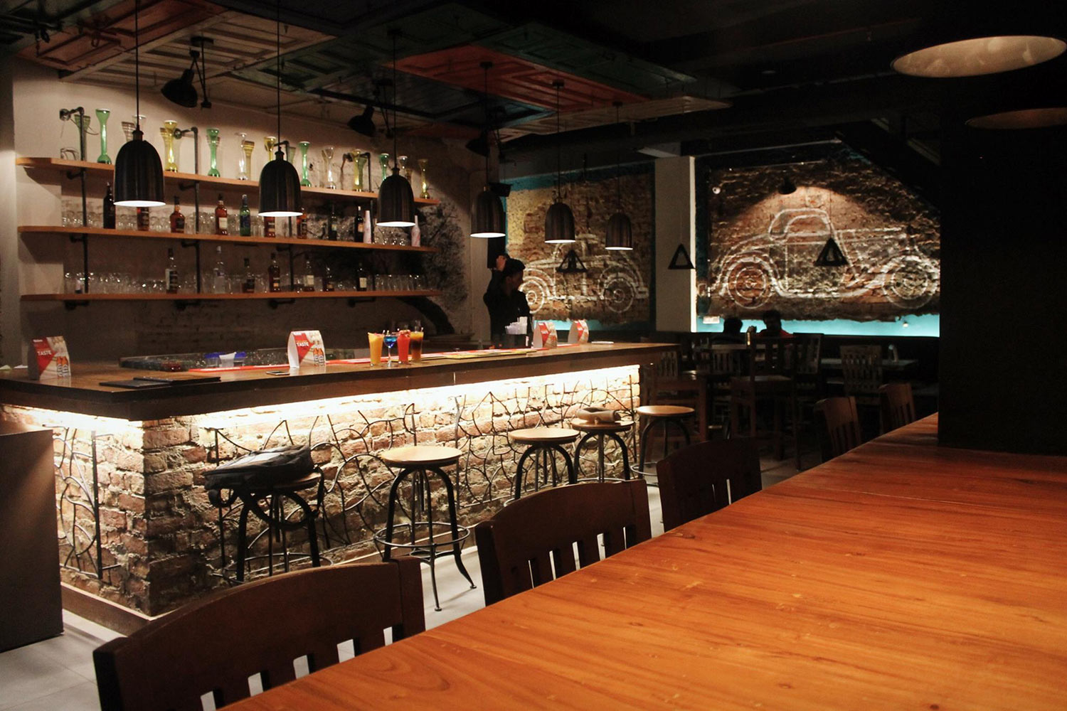 The design of this lounge demonstrates how restraint can be a compelling creative gesture. The space leverages its rustic setting and adds lighting to create an atmospheric dining environment that balances raw materiality with warmth. Exposed brick walls are left in their weathered state with dramatic uplighting that highlights hand-painted murals in white. These graphic elements are a direct reference to India’s unfiltered street culture. Exposing all structural elements, the ceiling creates a sense of depth and shadow above. Vintage style bulbs hover at varying heights adding a mysterious ambient glow. The materials utilized throughout minted to add a sense of tactility and prioritize durability. The bar continues the crude aesthetic as well. Open shelving makes glassware decor elements suited to the function of this space. Simple wooden dining tables pair with spindle-back chairs. The flooring uses large format grey tiles that remain muted and allow the walls and ceiling to dominate.