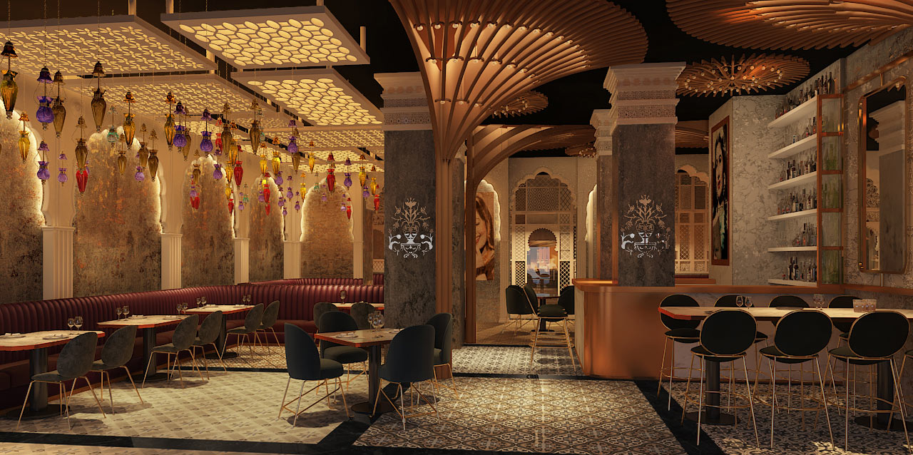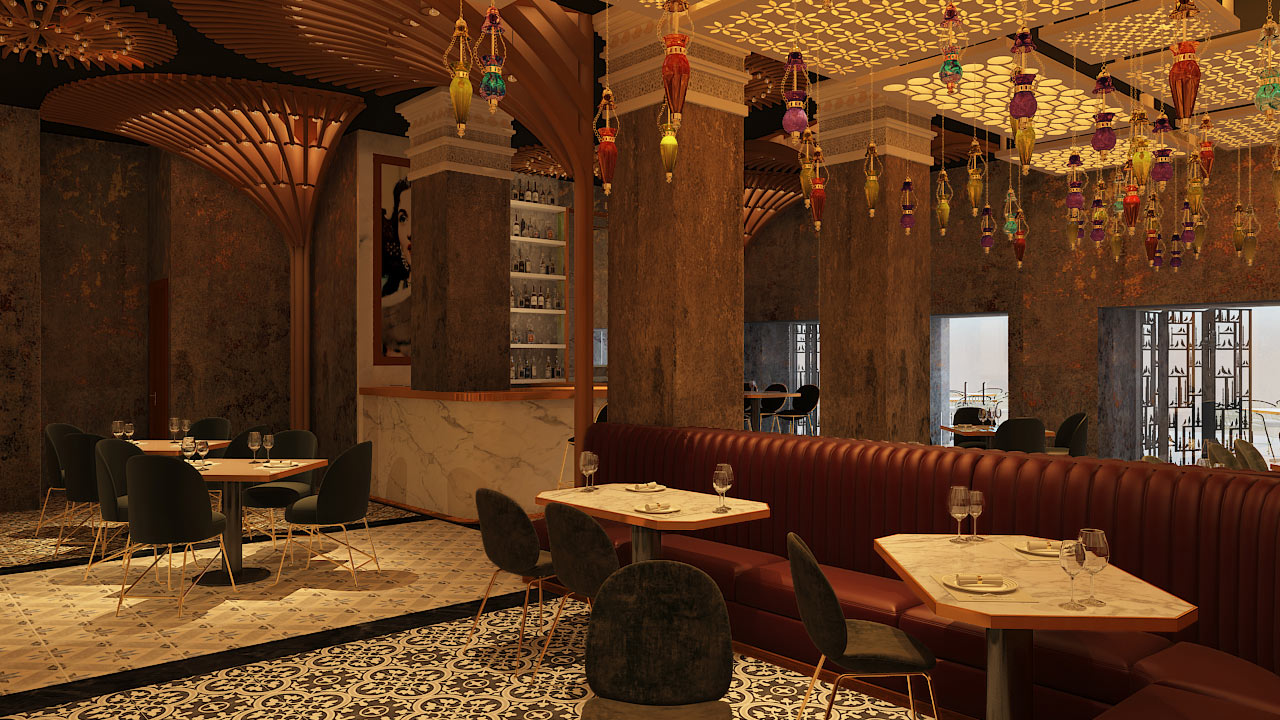The ceiling becomes the centerpiece as an intricate composition of backlit geometric panels wash the space with an ambient and honeyed glow. Wooden ribs fan out from the columns like stylized palms. Multiple coloured glass lanterns in jewel tones and moroccan shapes hover at different heights. Seating tinted in forest hues, splits between deep brown leather banquettes and freestanding tables with dark upholstered chairs on sleek legs. Patterned tiles underfoot add to the eclectic energy prevalent throughout. Weathered plaster walls in ochre and decorative screens act like textural backdrops uplifting the design. Synonymous to it all, the bar continues this language too; brass accents, marble counters and backlit displays extend the existing dialogue between craft and contemporary design.