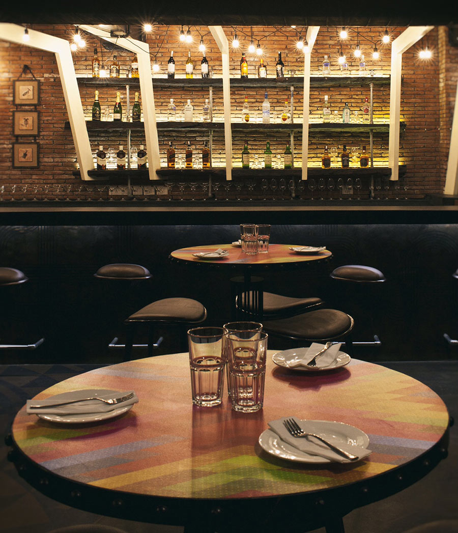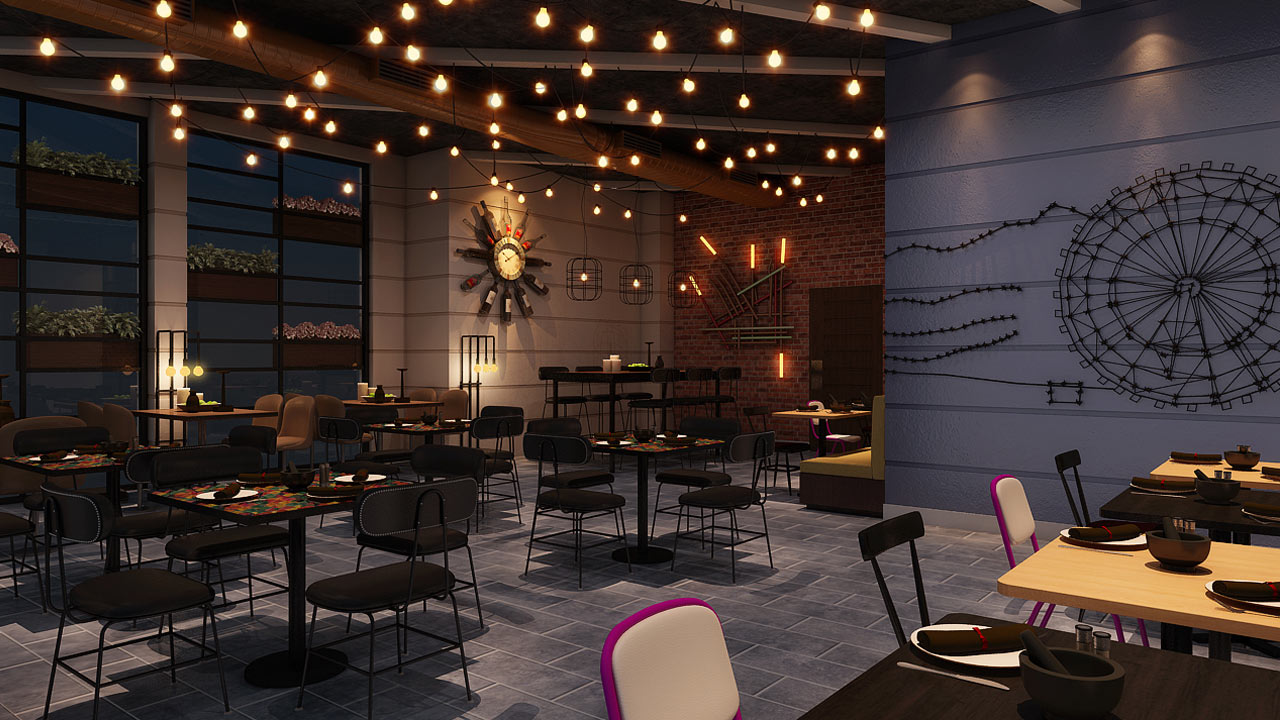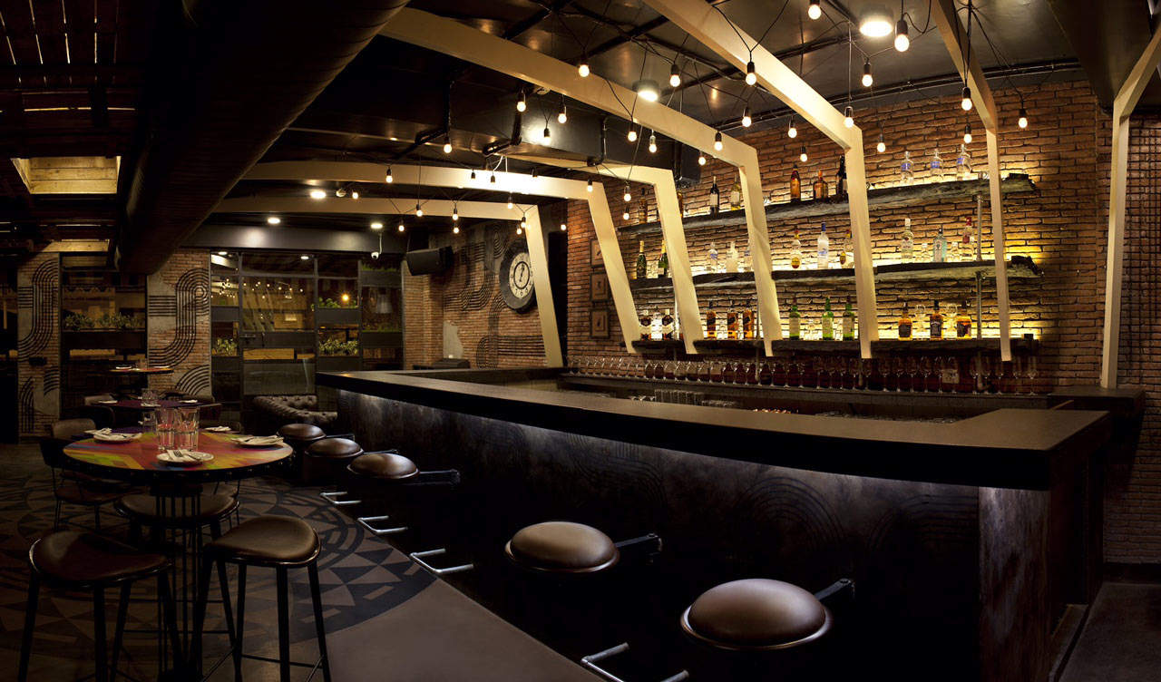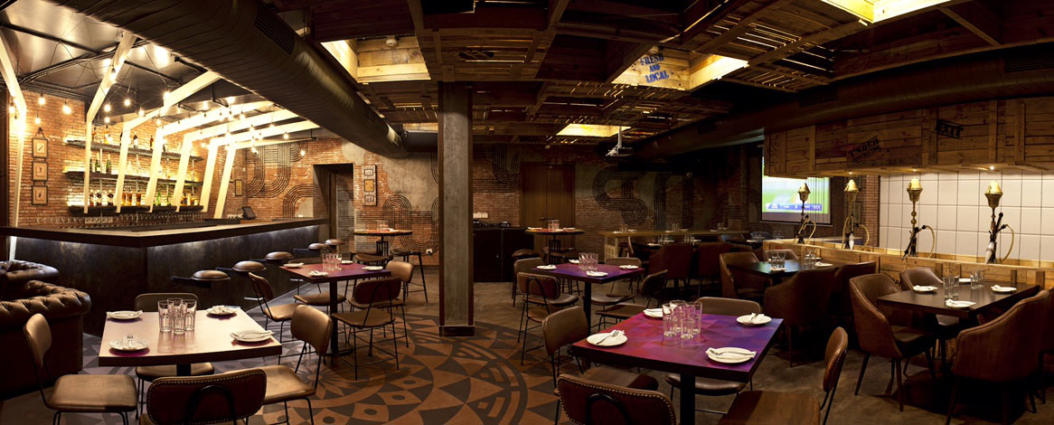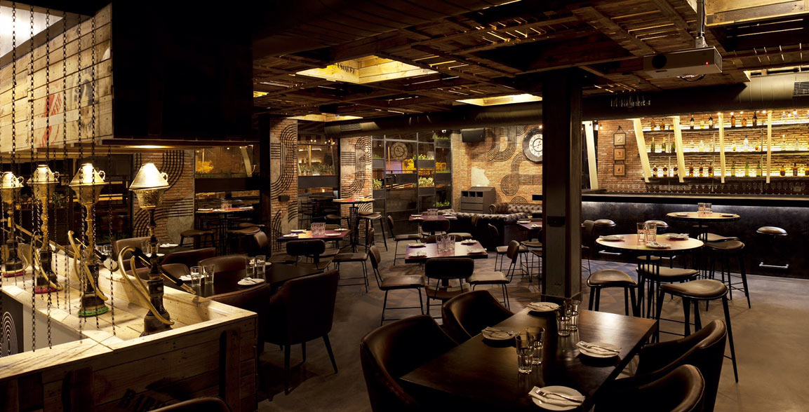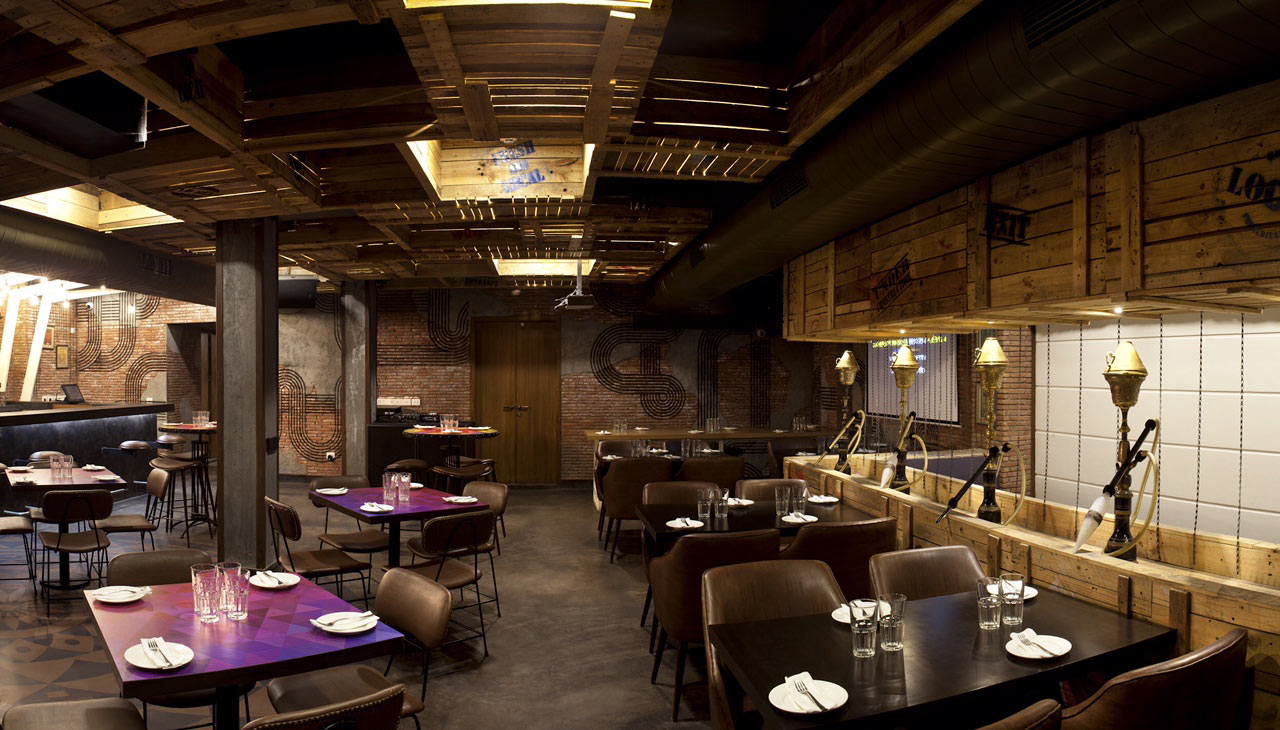 The most captive feature is the overhead treatment: massive angled wooden beams painted in cream form a geometric canopy that contrasts with the rather dark painted ceiling and exposed ductwork. These dramatic diagonal members create visual dynamism while concealing functional systems. Beneath this, lighting in casual zigzag patterns provides an ambient glow, their bulbs adding a vintage industrial character. The materiality emphasizes authenticity and patina: exposed brick walls hold sculptural wire artwork depicting hookahs and decorative motifs that reference Middle Eastern heritage through contemporary line drawings. Furniture chosen maintains dark tones and compact profiles: deep brown leather button-tufted banquettes provide luxurious seating along walls, while simple metal-framed cafe chairs in black maintain casual accessibility. Some tables feature tessellated purple tops that inject unexpected colour adding pop against the prevalent palette. The monumental rustic bar showcases backlit shelving behind a matte black counter.