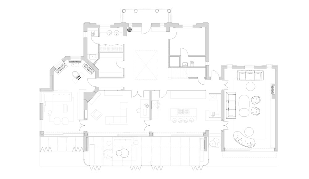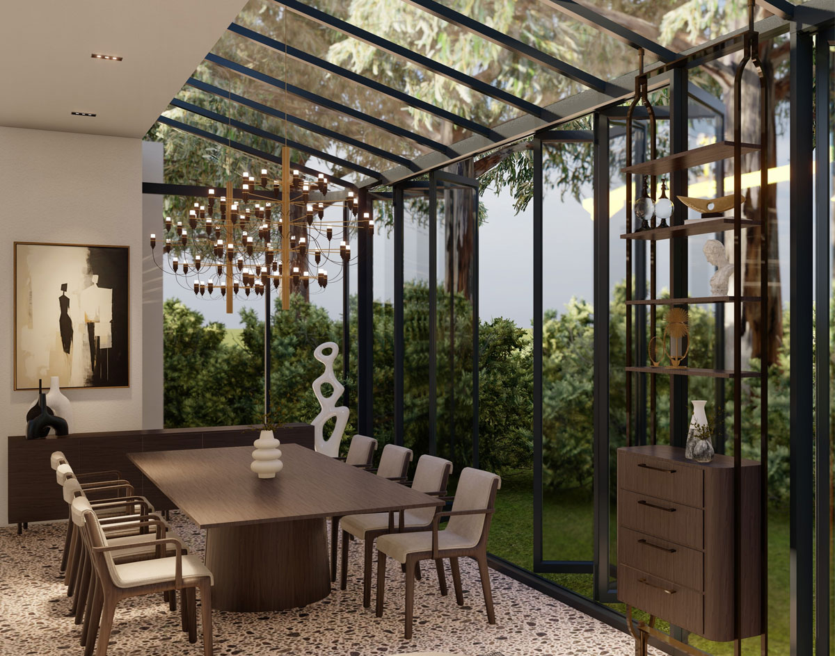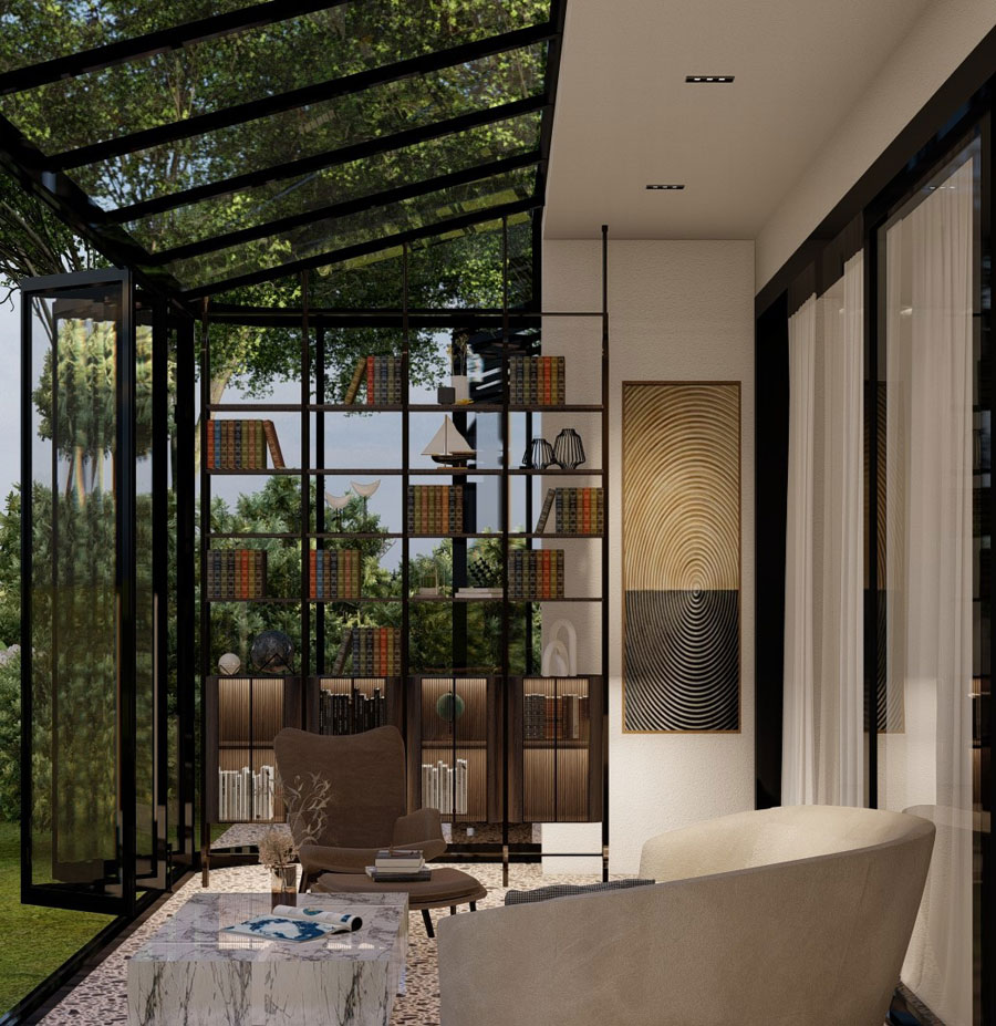 This house is designed to live and age with its residents. A glass-roofed conservatory runs along one side, where black steel frames blur the edge between indoors and outdoors. Light filters through the dense tree canopies above, softened before it touches the rooms inside.