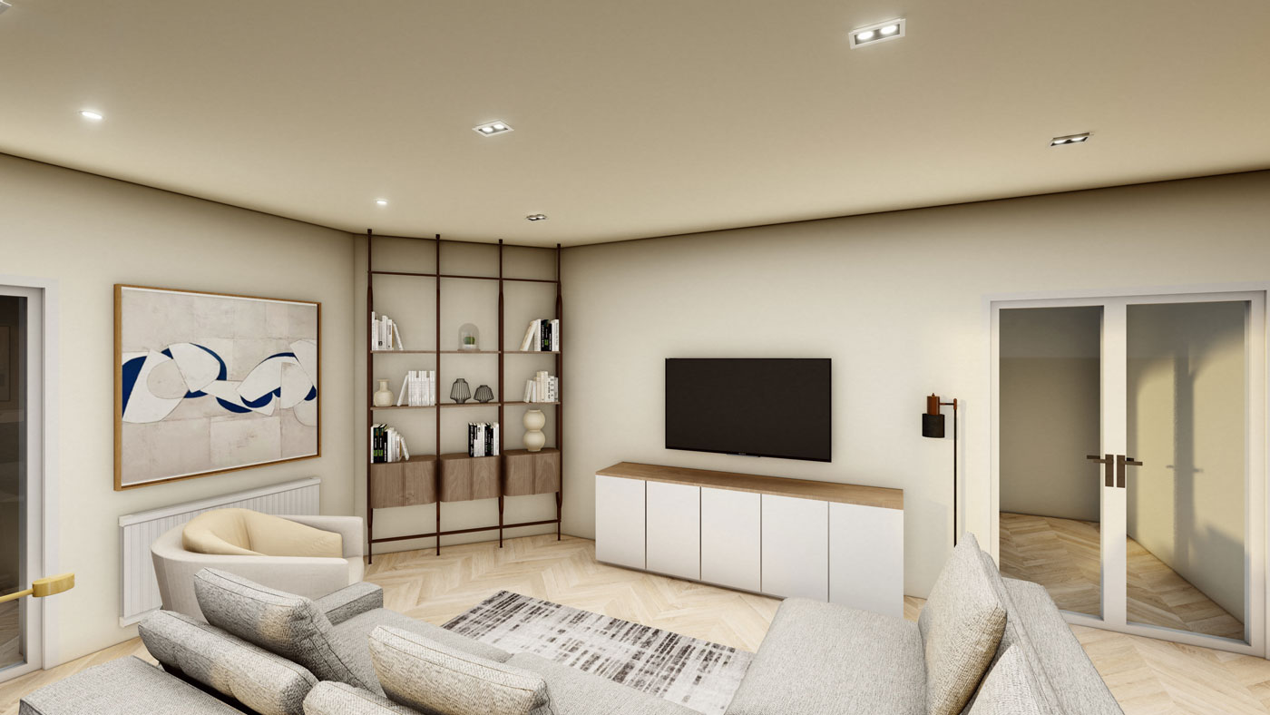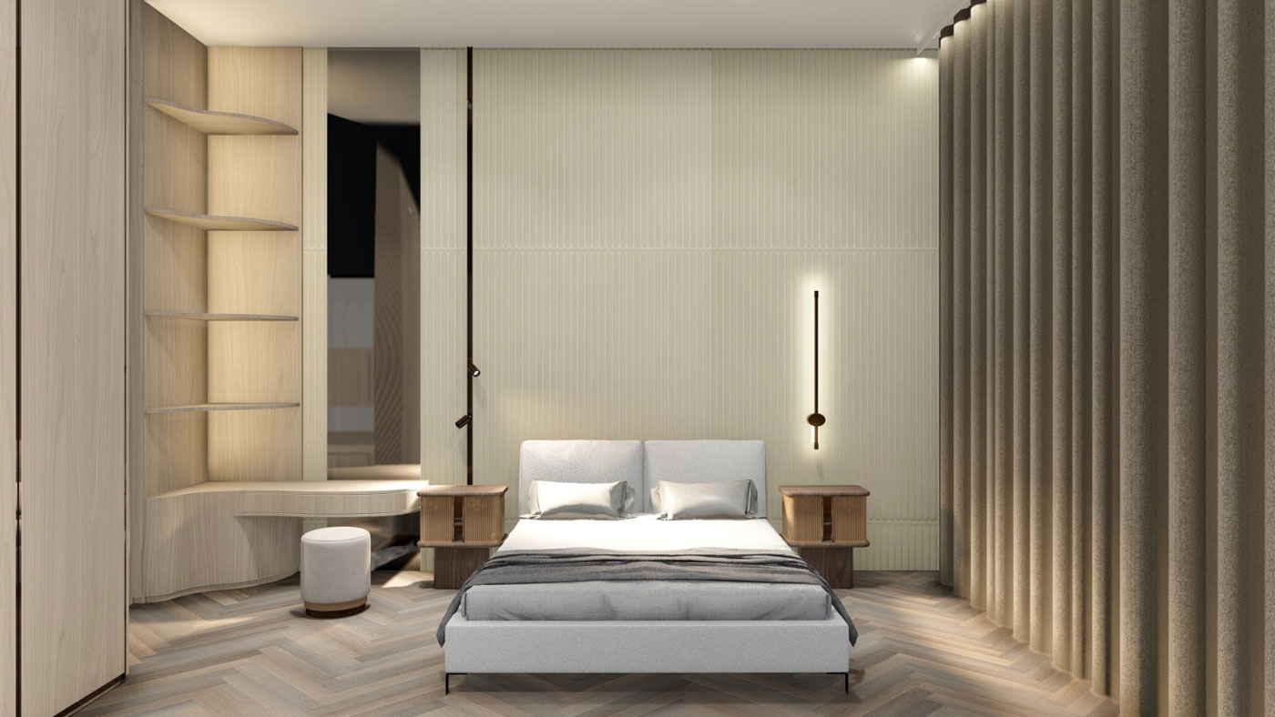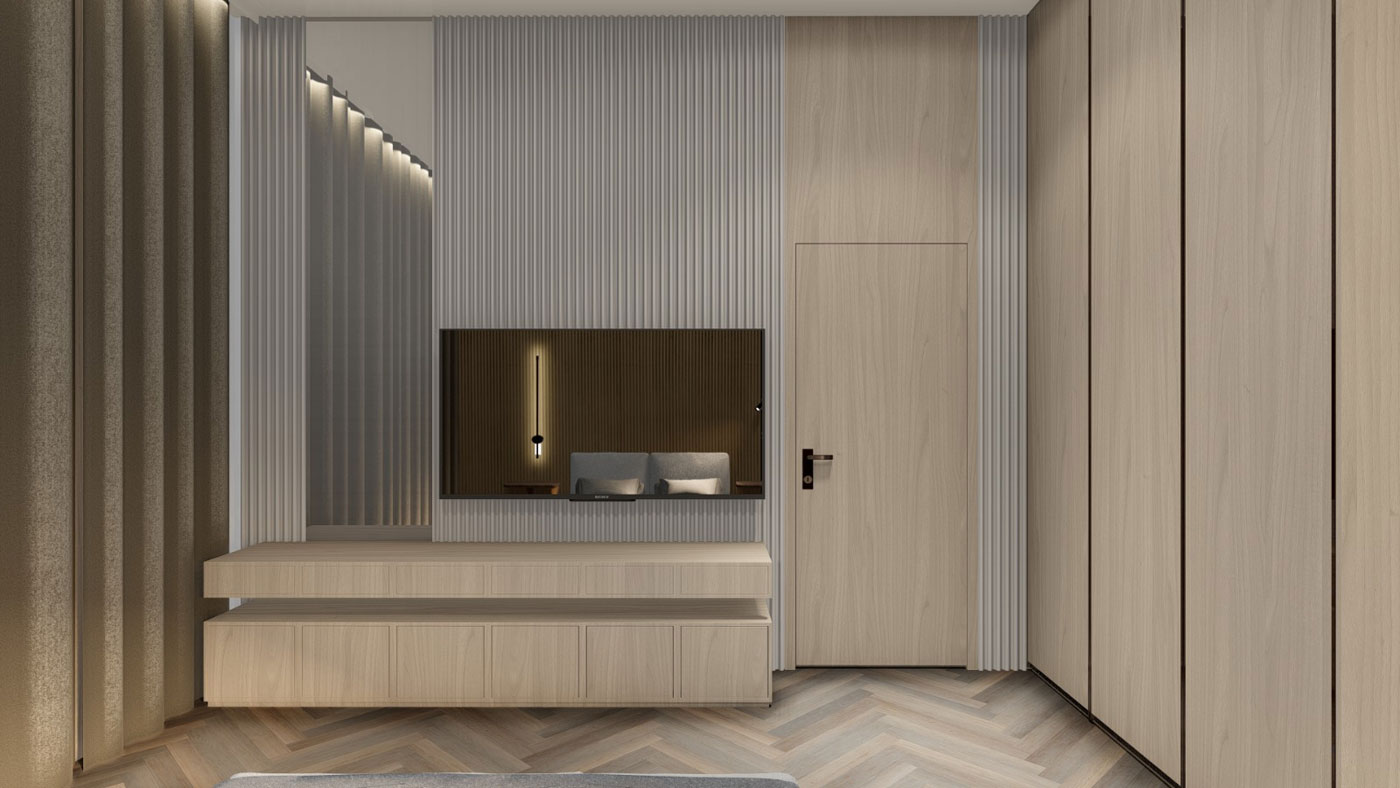 The interiors carry that calm forward. Oak floors in herringbone, walls the shade of raw linen, and furniture that’s earthy. The palette deliberately holds steady as patterned rugs break things up, their geometric prints and traditional motifs adding weight without volume. Spaces flow into each other with ease. Living spaces connect through doorways and transitions framed in darker wood. The primary bedroom wraps itself in vertical fluted walls all of it ribbed like corduroy. The dining area opens completely to the garden through the conservatory roof overhead turning meals into something between indoors and a picnic. A single chandelier hovers low, sculptural and oversized.