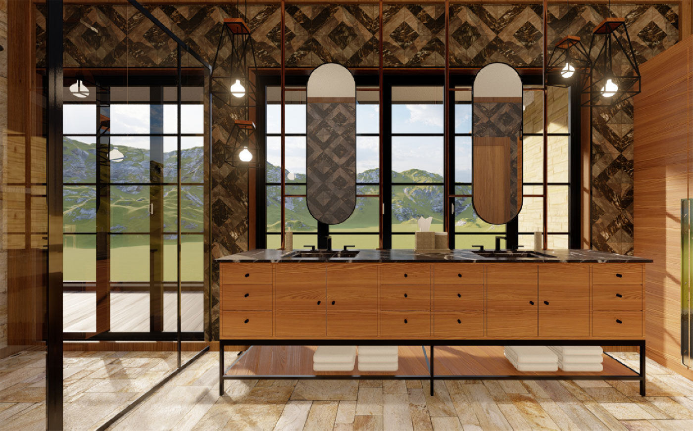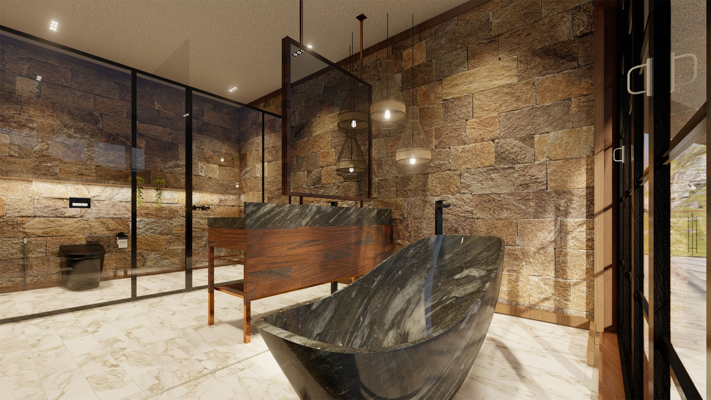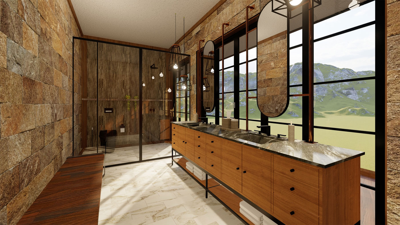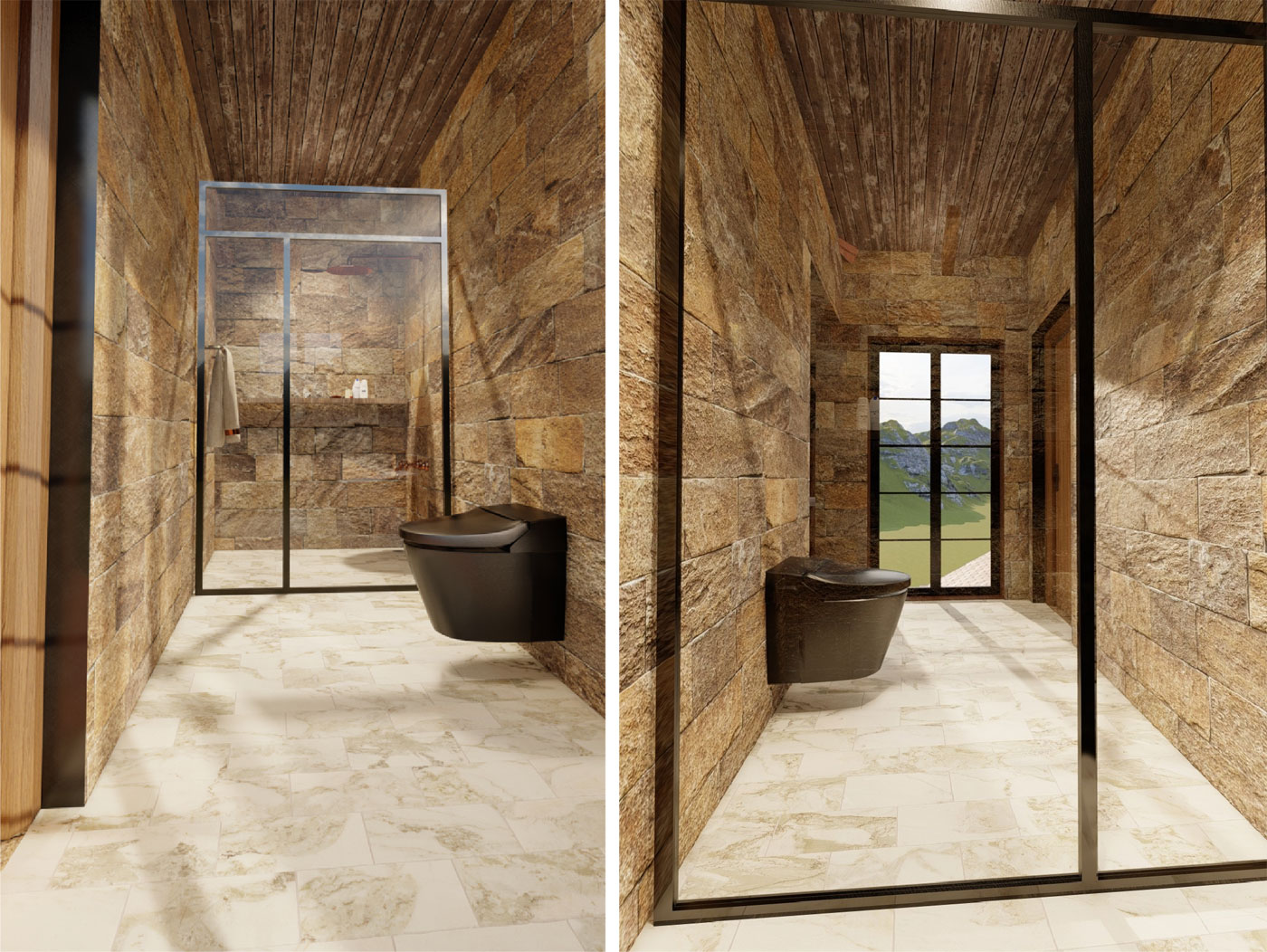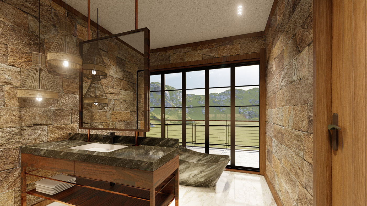 Inside, stone walls, warm wood, and patterned tiles enrich the palette without competing with the views. Every detail is shaped to echo the surroundings, making the home feel less like an escae within the mountains and more like a continuation of them.