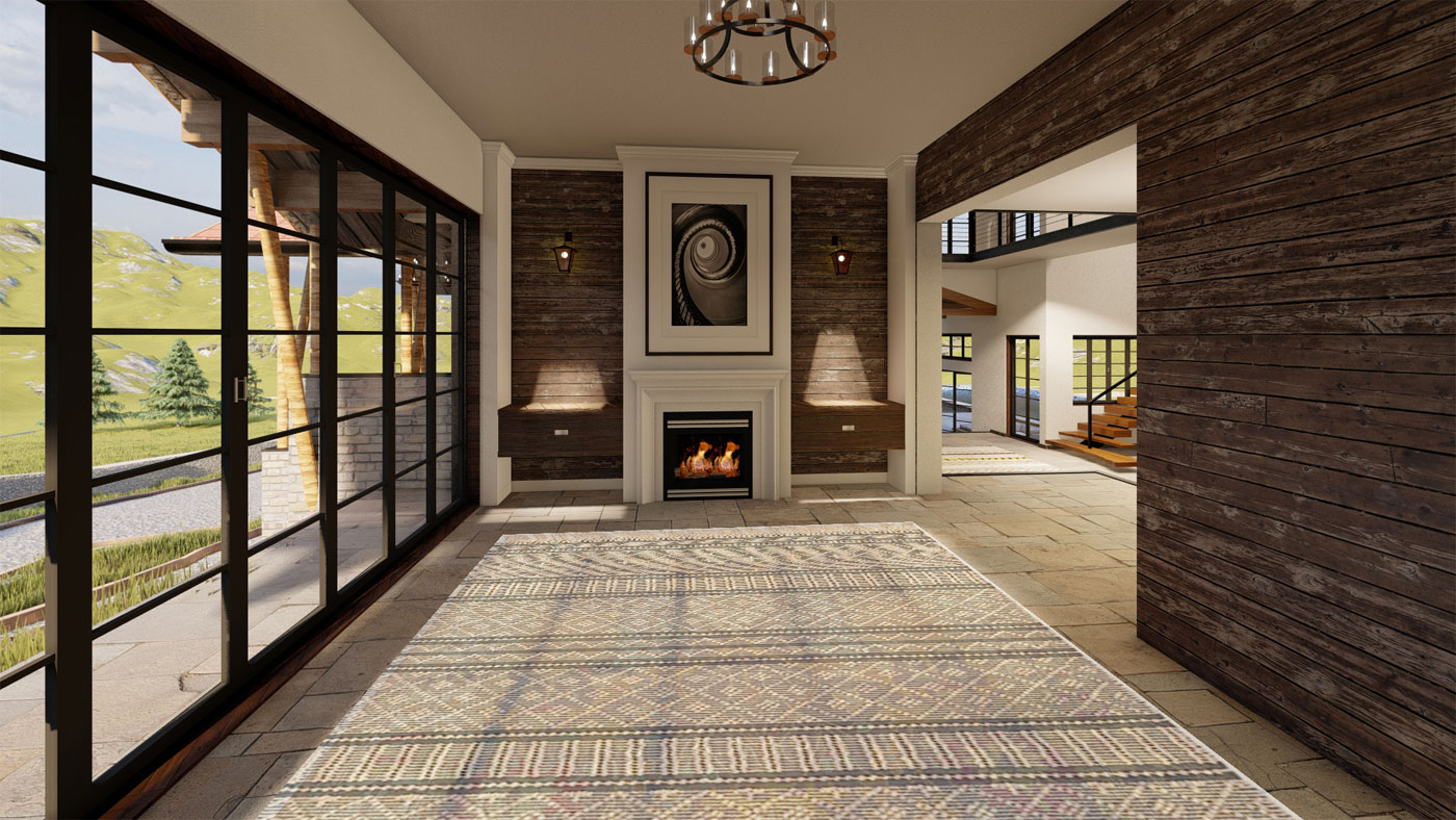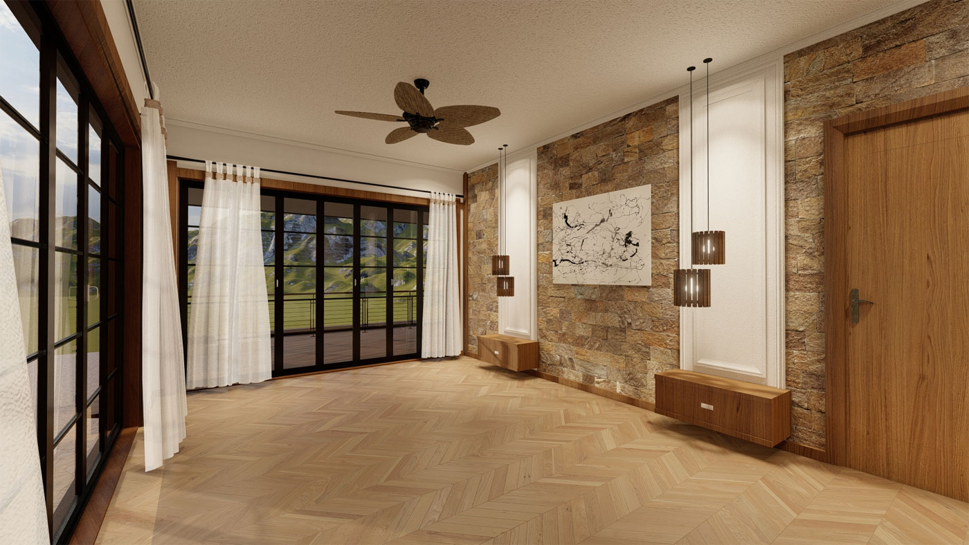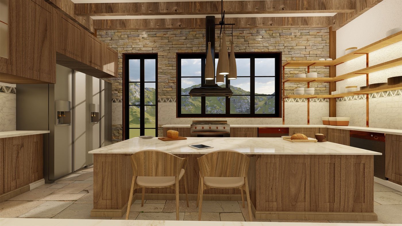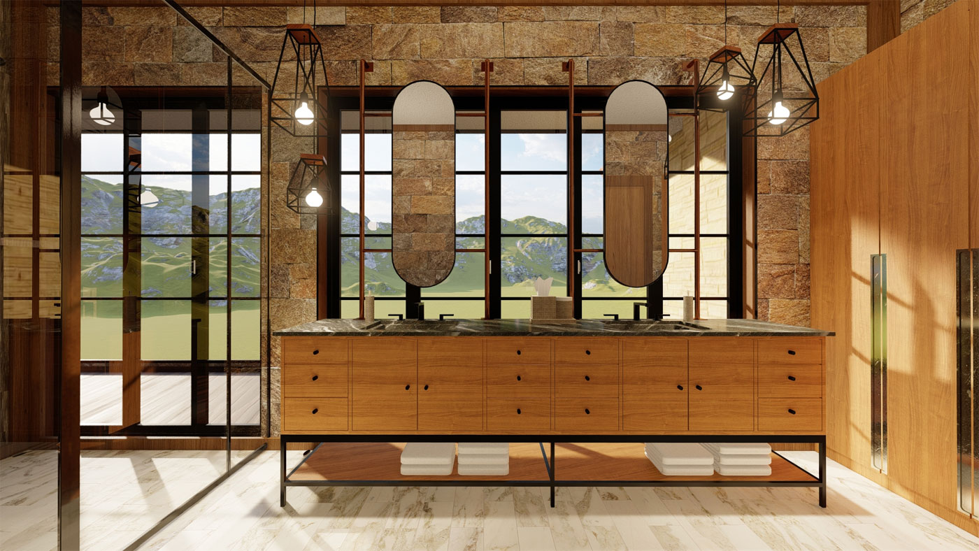Inside, stone walls, warm wood, and patterned tiles enrich the palette without competing with the views. Every detail is shaped to echo the surroundings, making the home feel less like an escae within the mountains and more like a continuation of them.