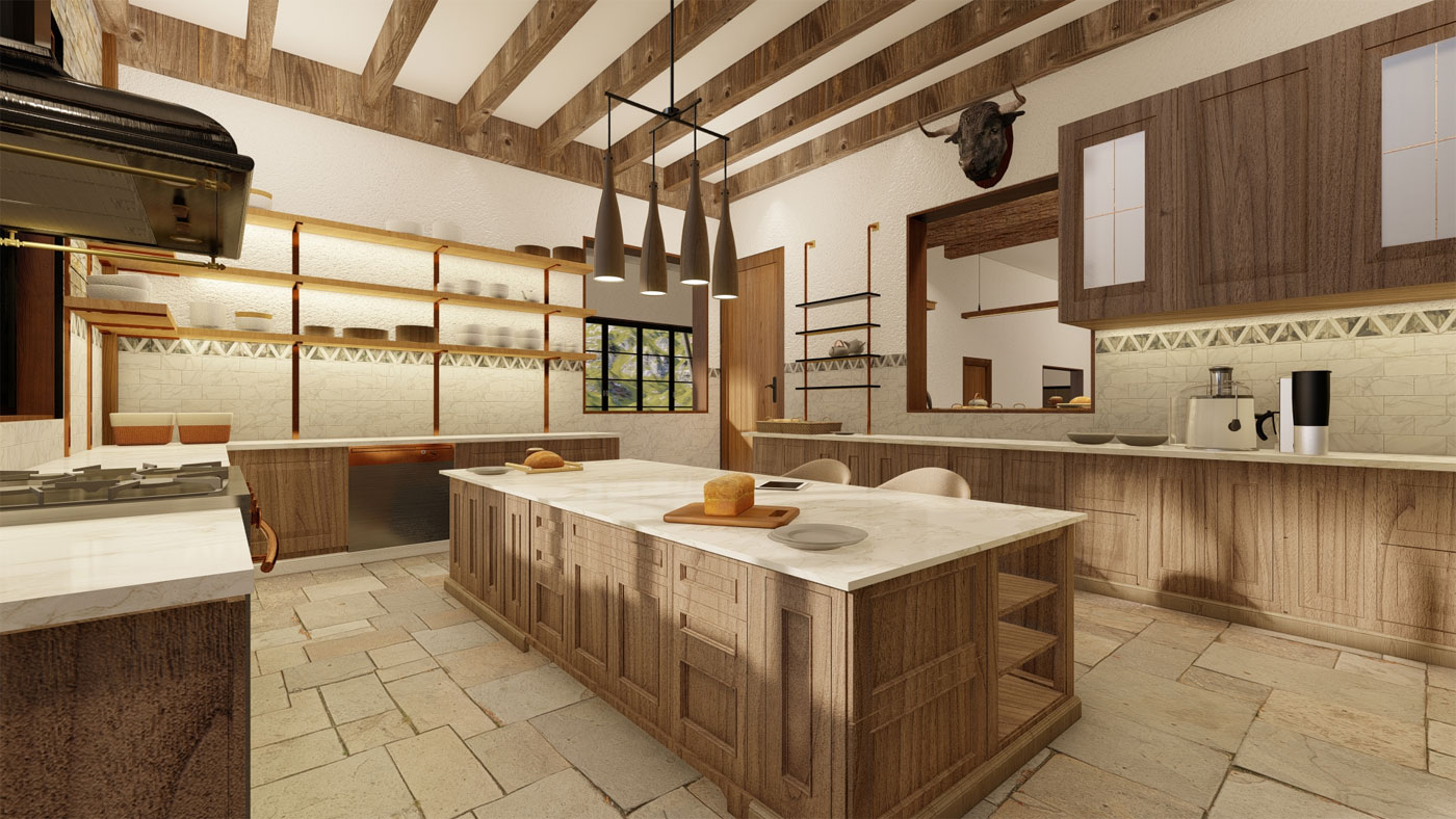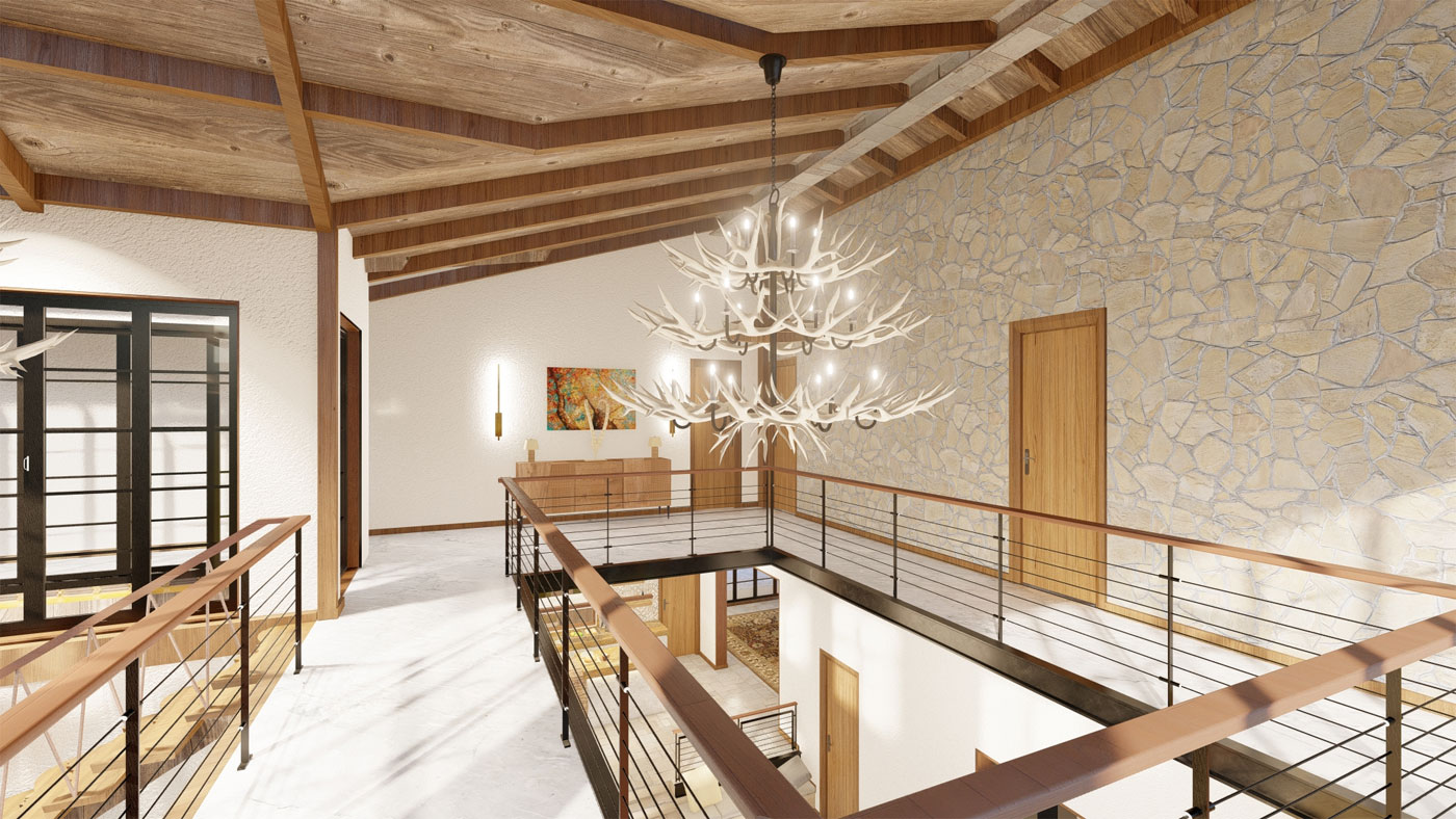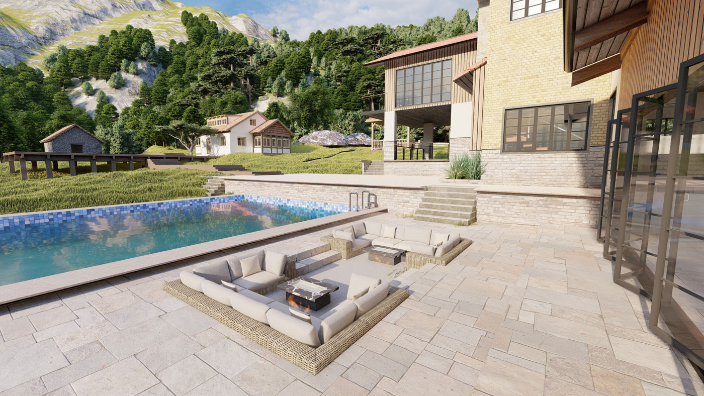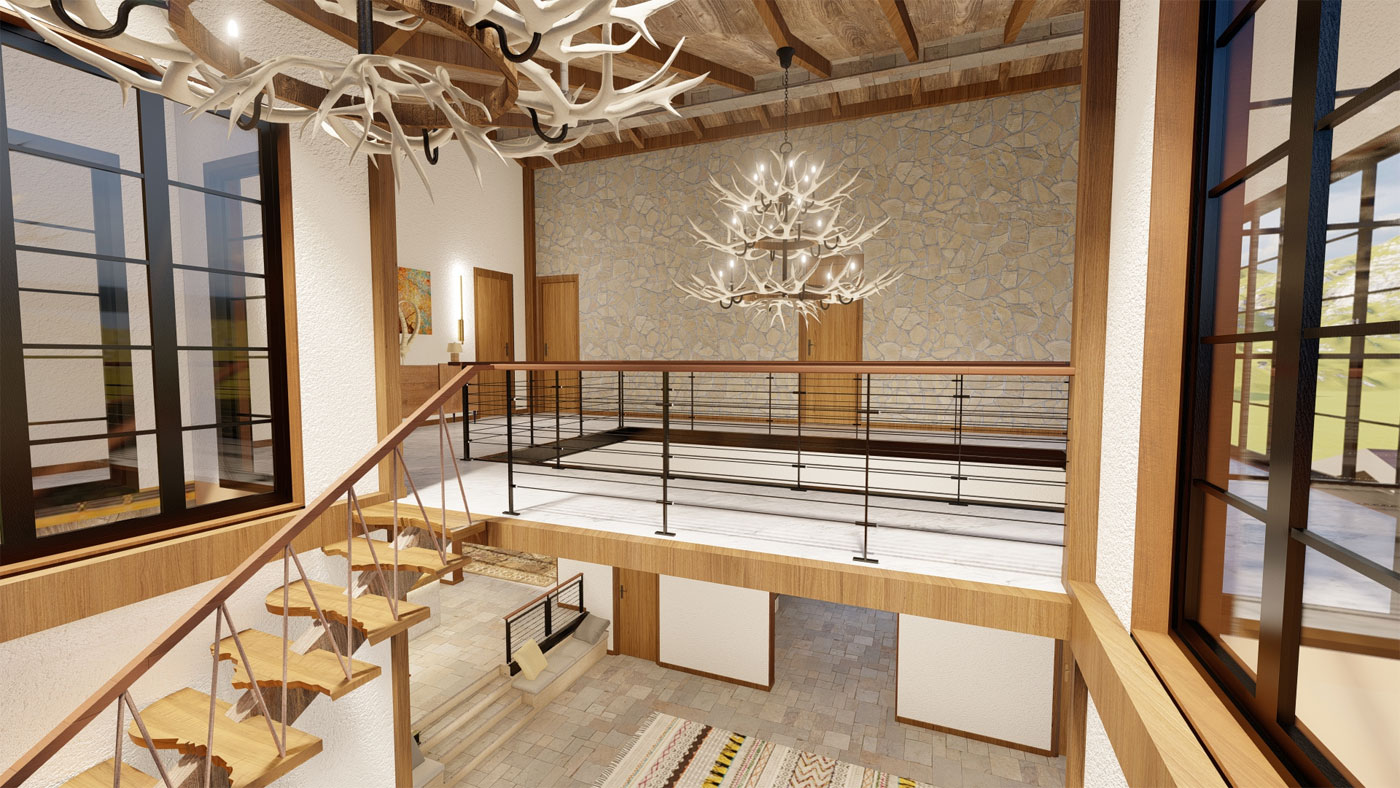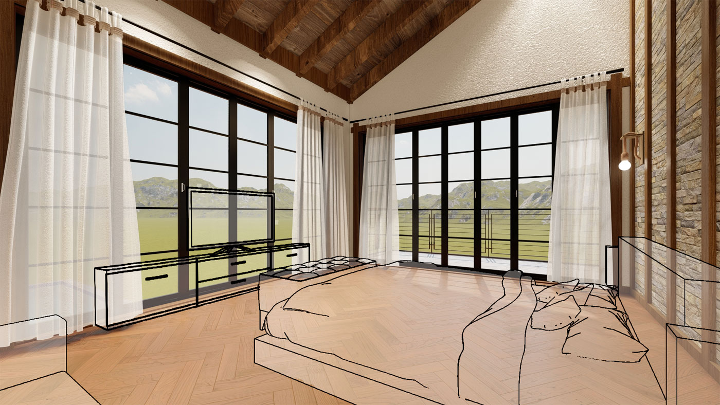Inside, stone walls, warm wood, and patterned tiles enrich the palette without competing with the views. Every detail is shaped to echo the surroundings, making the home feel less like an escae within the mountains and more like a continuation of them.