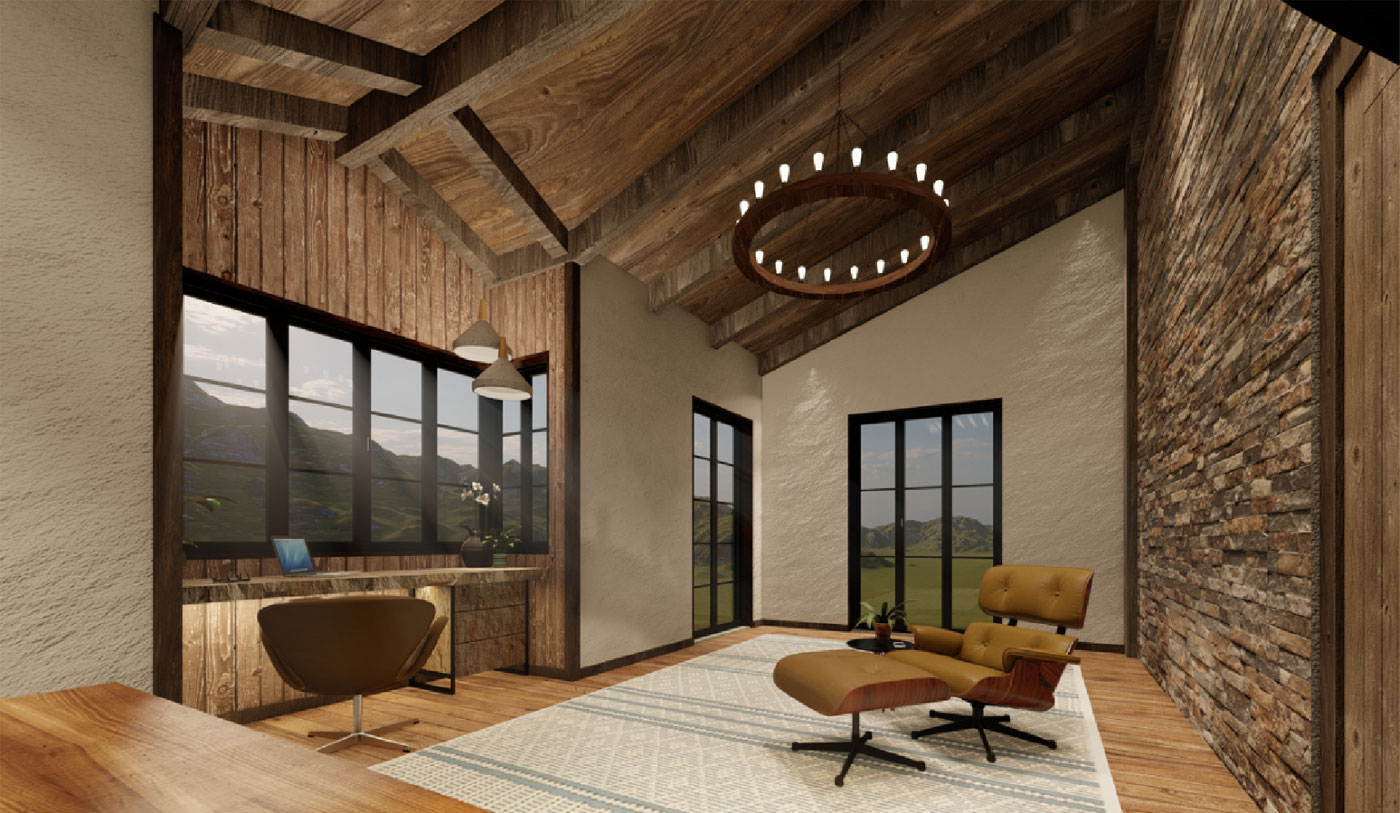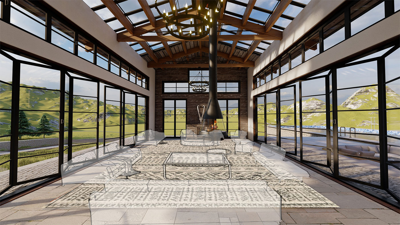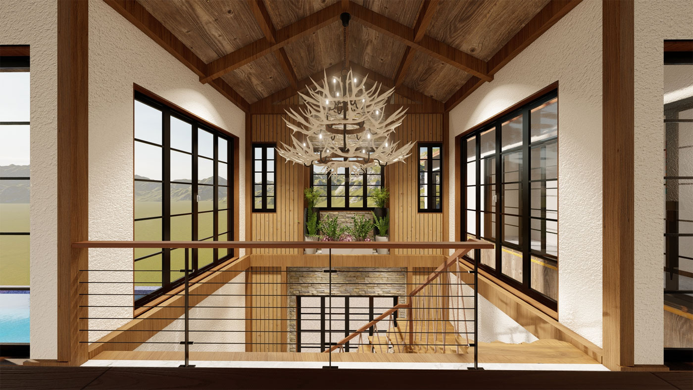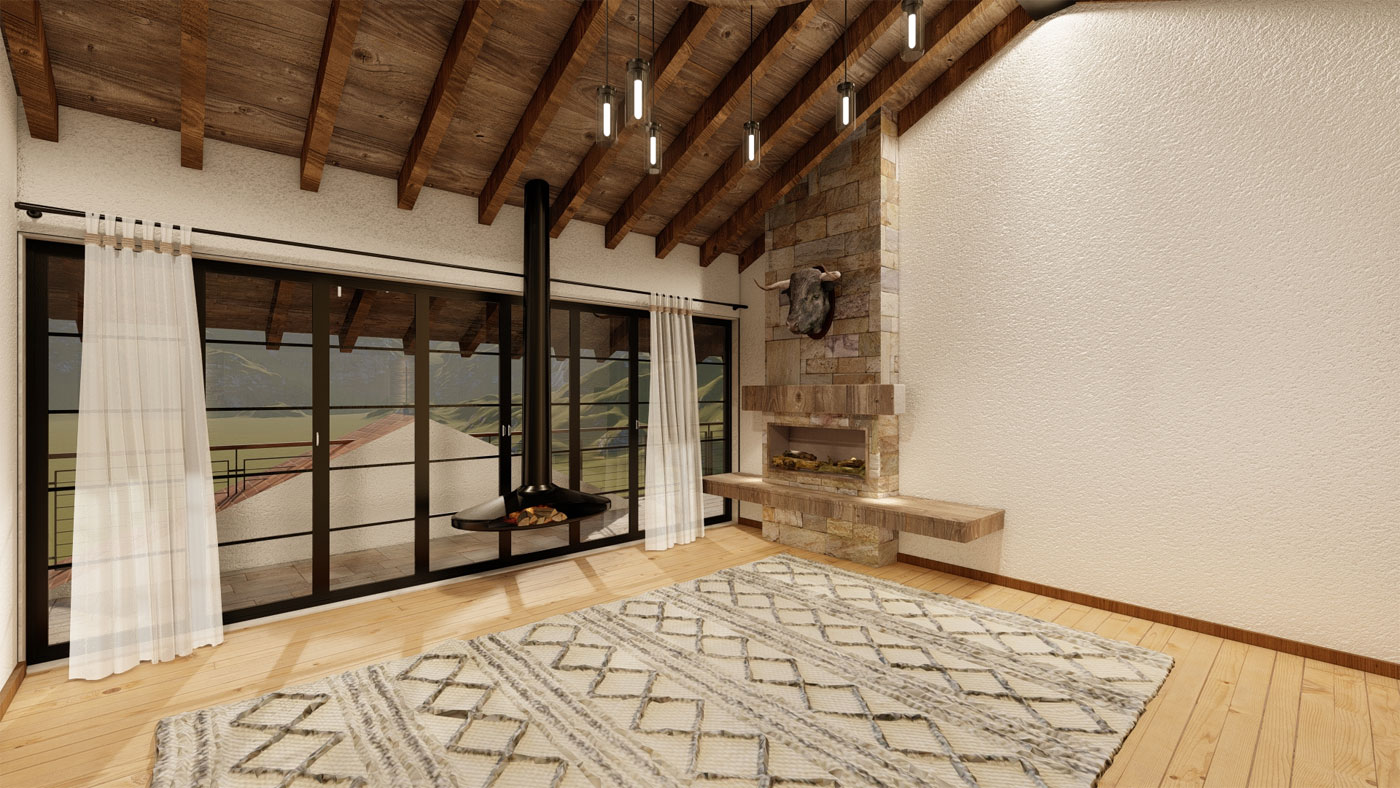 The architecture puts views front and center. Expansive windows frame sweeping scenery views from every angle, while open-beam ceilings and double-height volumes connect the interiors to the surrounding peaks. A central fireplace anchors the main living space, enhanced by a skylight overhead that draws natural light deep into the heart of the home. The kitchen both social and practical, is designed with chef-grade appliances, a generous island for gathering, and backlit shelving that turns collections into display. Double-height ceilings ensure the room remains open and lively, even when filled with people. Outside, the pool and multiple terraces take full advantage of the setting. Whether you’re swimming or lounging by the outdoor fireplace, the mountains are a constant backdrop.