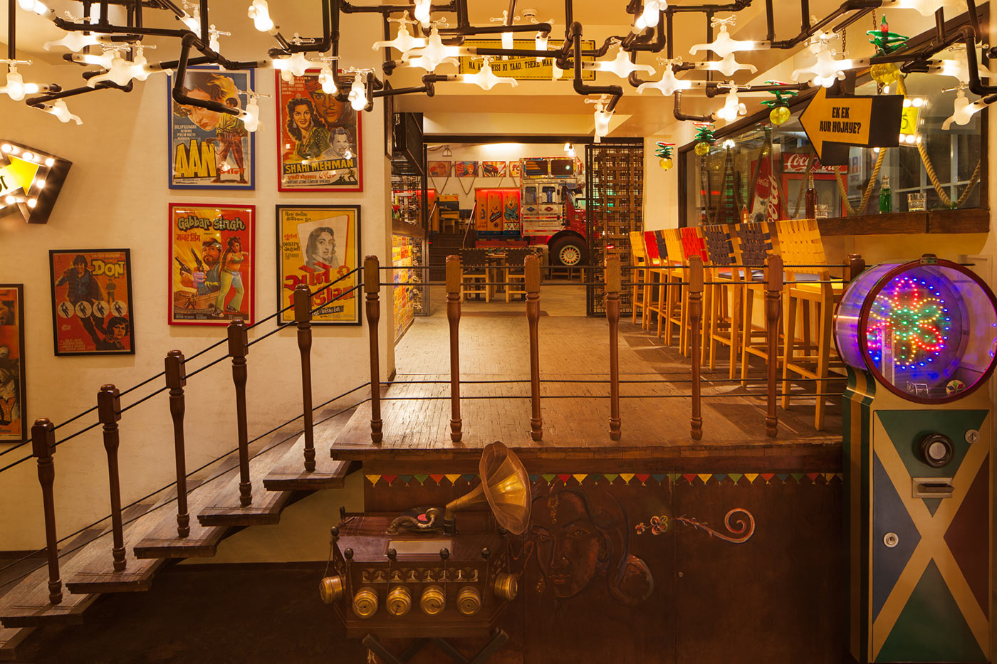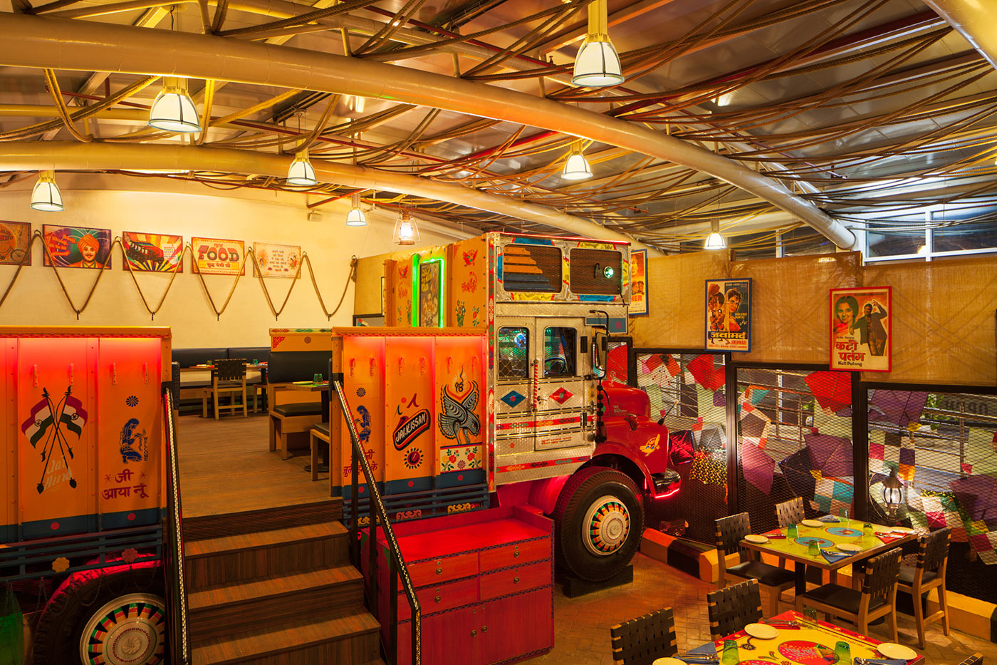 A full-scale decorated truck is positioned in the center to serve as sculpture as well as functional seating anchoring the entire space. Hand-painted in vibrant reds, blues and yellows with traditional motifs, tassels and metallic embellishments, this vehicle becomes the literal and conceptual heart of the project. The truck’s cargo bed transforms into an elevated dining platform, allowing guests to dine within it. Surrounding booths feature truck-inspired partition walls painted in lively orange and green with folk art detailing and neon edge lighting. The ceiling exposes all industrial ductwork with custom light fixtures crafted from repurposed truck parts such as headlights and grilles. Walls hold vintage Bollywood posters in bold red and yellow frames alongside hand-painted door panels from real trucks mounted as artworks. Following the chaos, the flooring employs multiple patterns and materials that transition between zones.