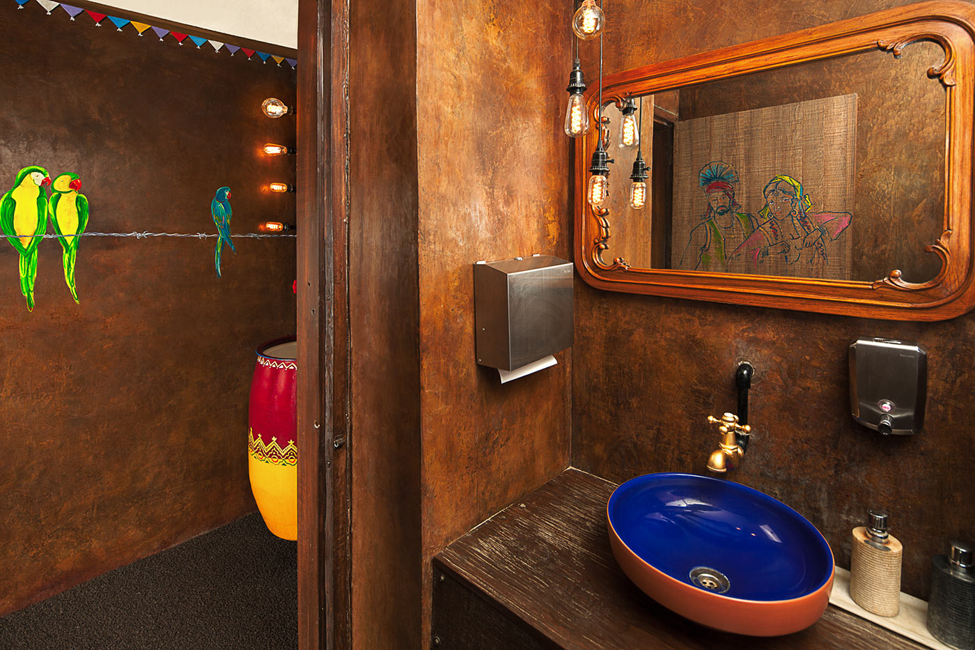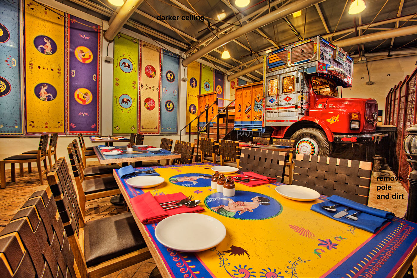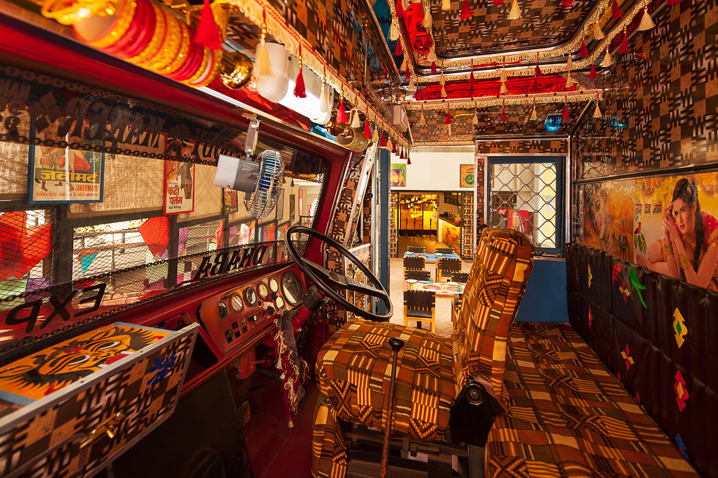 Custom table runners with folk embroidery echo truck textile traditions, while woven chairs and colorful placemats maintain the spirited craft-centric aesthetic throughout. In essence the restaurant is a cultural commentary that celebrates India's restless energy with vigor and heart.