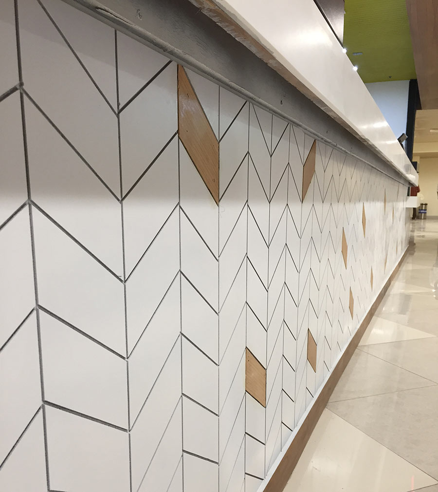 The ceiling treatment features alternating warm wood-toned and dark composite panels with integrated lighting strips providing ambient and uniform illumination to this voluminous space.