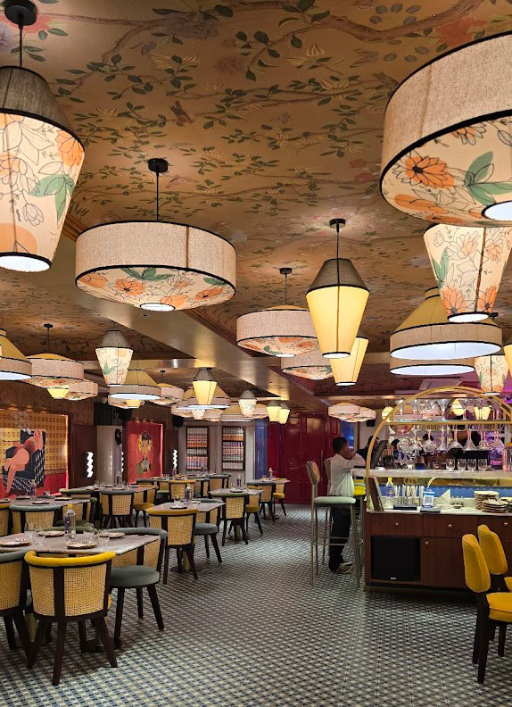 Hand-painted murals depicting delicate branches, blossoms and birds in soft pastels envelope the ceiling and upper walls. These botanical narratives provide a backdrop against the bold contemporary portraits emerging from the opposite walls with stylized painted figures.