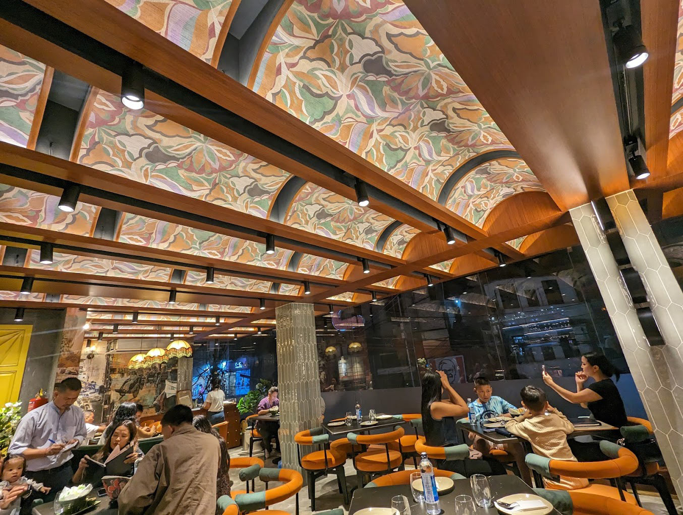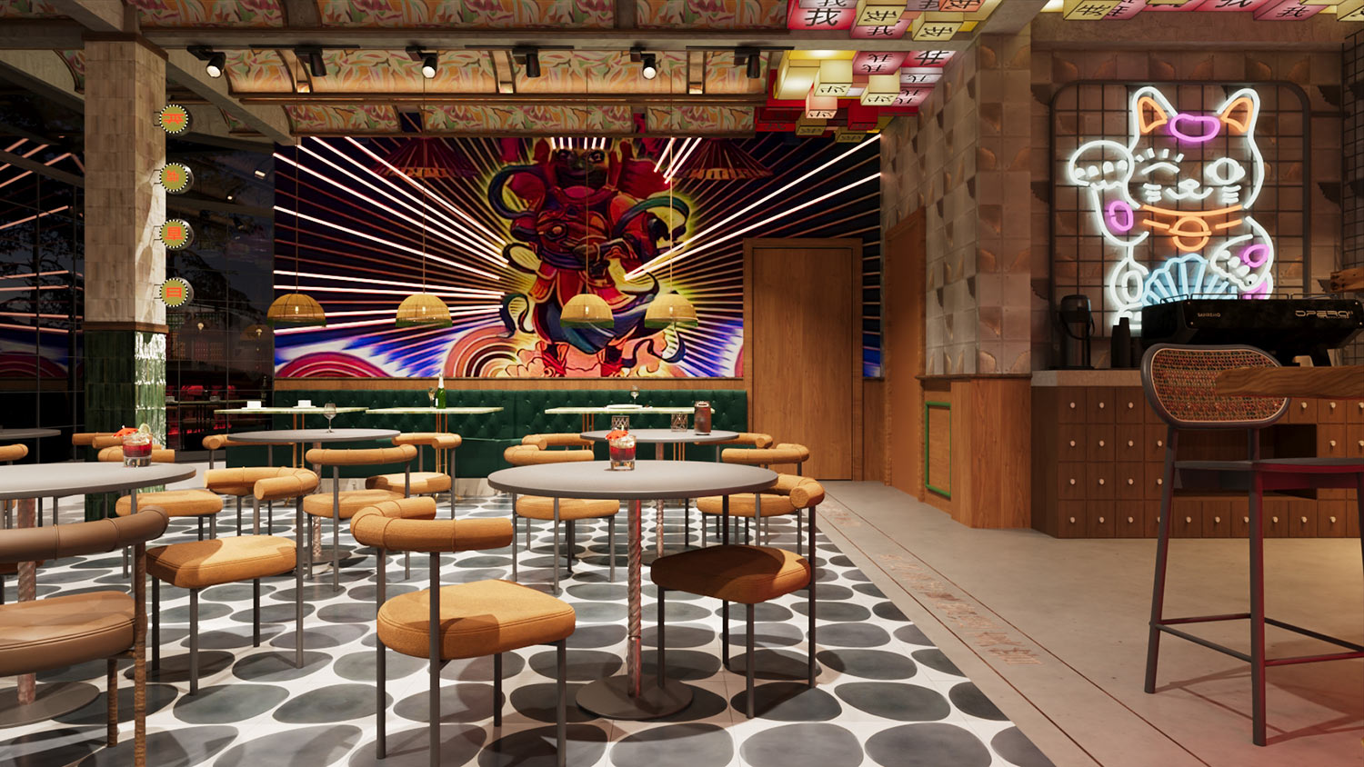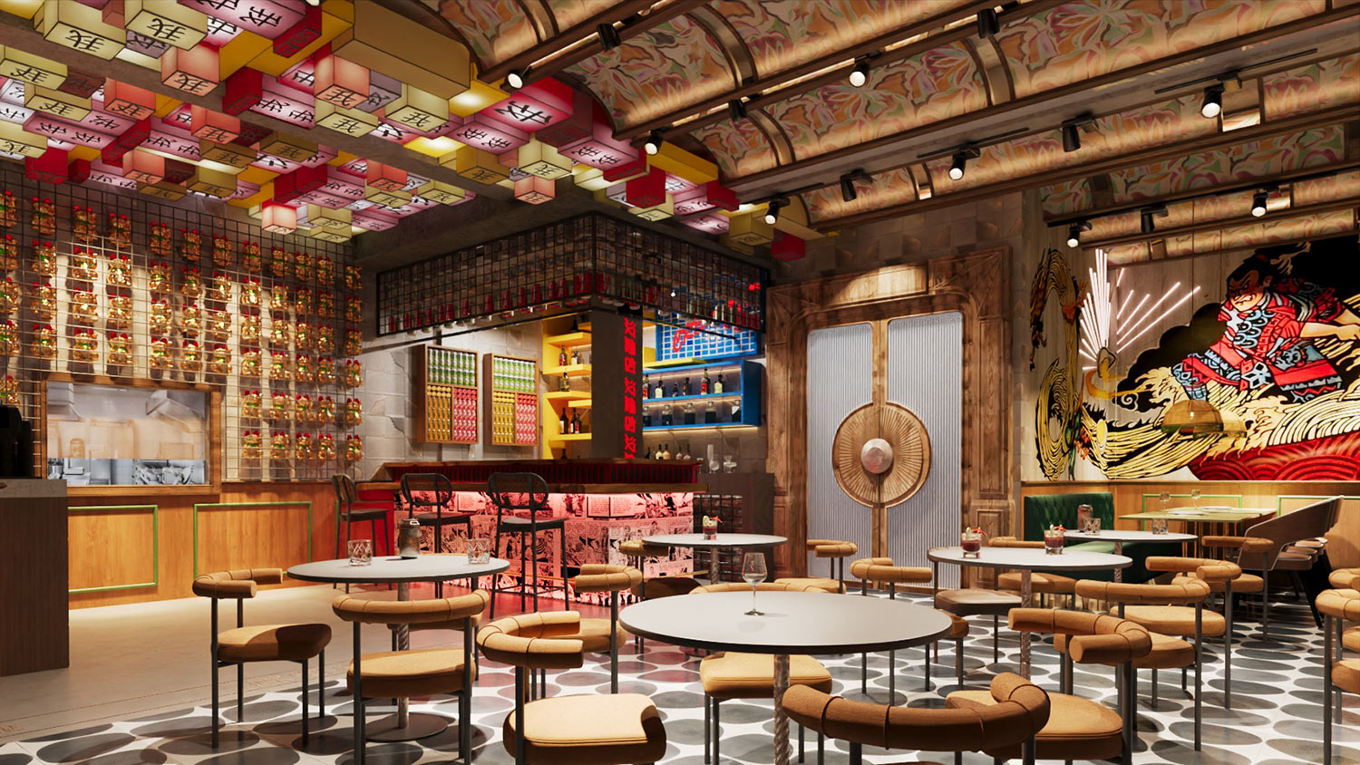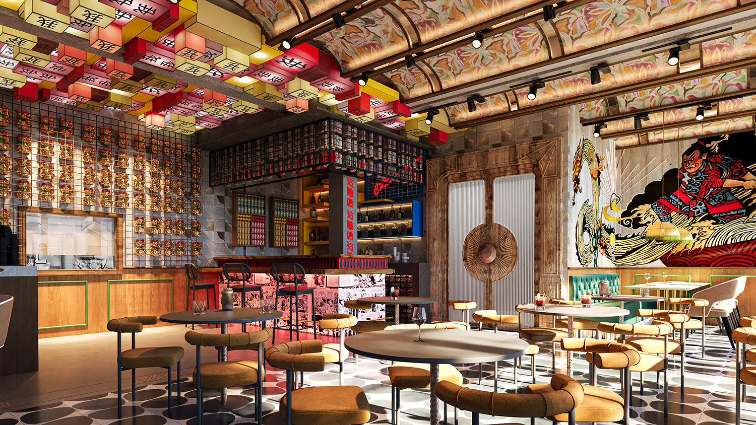 A striking combination of painted floral murals with exposed timber beams frame the ceiling in decorative panels. Illuminated box signs in red, pink and yellow, bearing Chinese characters, suspended below creating a lit up grid washing the space in an amber glow. Photo-realistic murals depicting vintage street scenes and cultural iconography dominate the walls. The bar tucked in one corner, displays cans and bottles arranged in gradients behaving much like functional art. Custom neon signage depicting widely known characters adds to the sense of whimsy and youth appeal. The furniture favours curves and plush comfort while the flooring features large scale geometric patterns in black and white anchoring the visual complexity above.