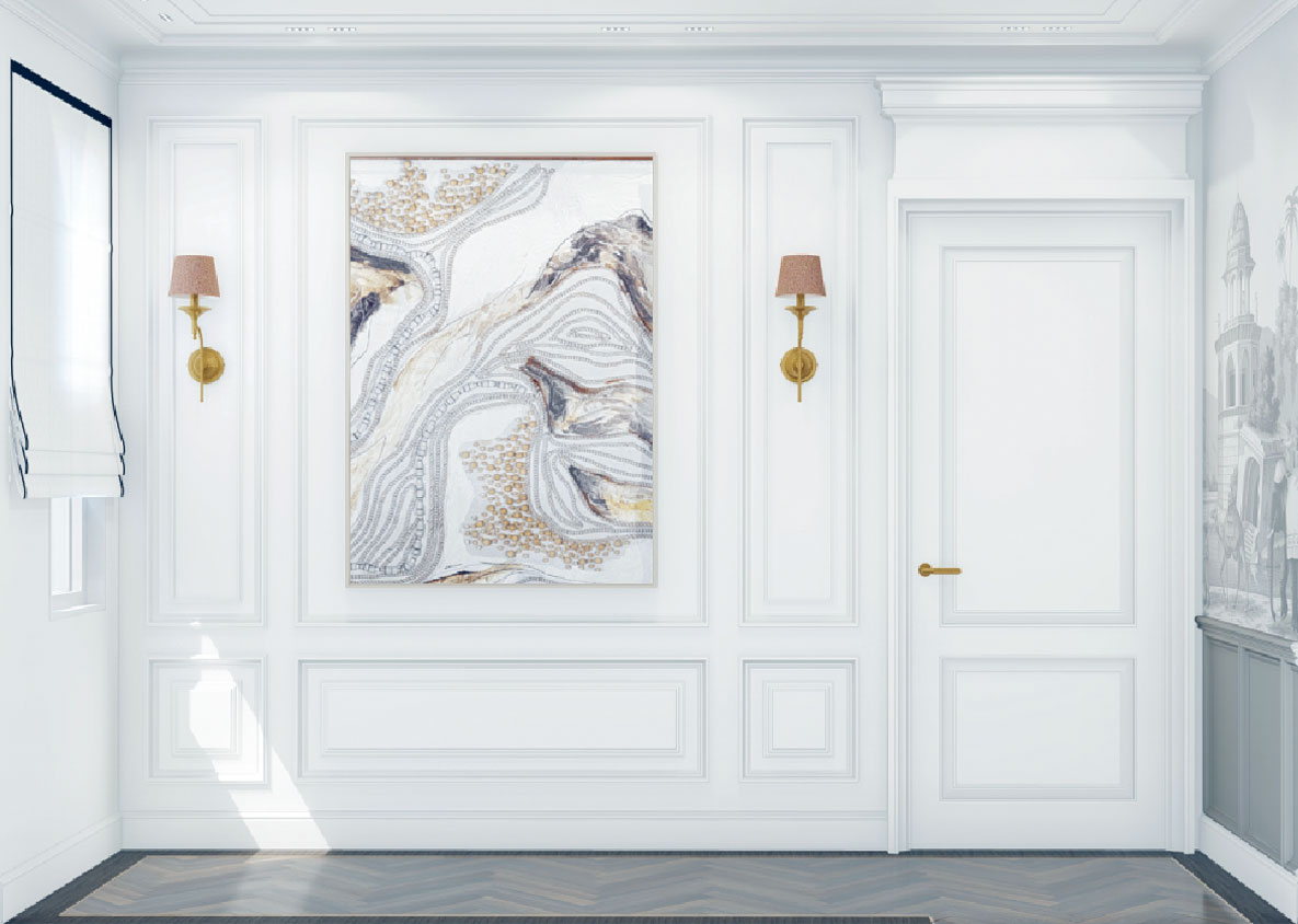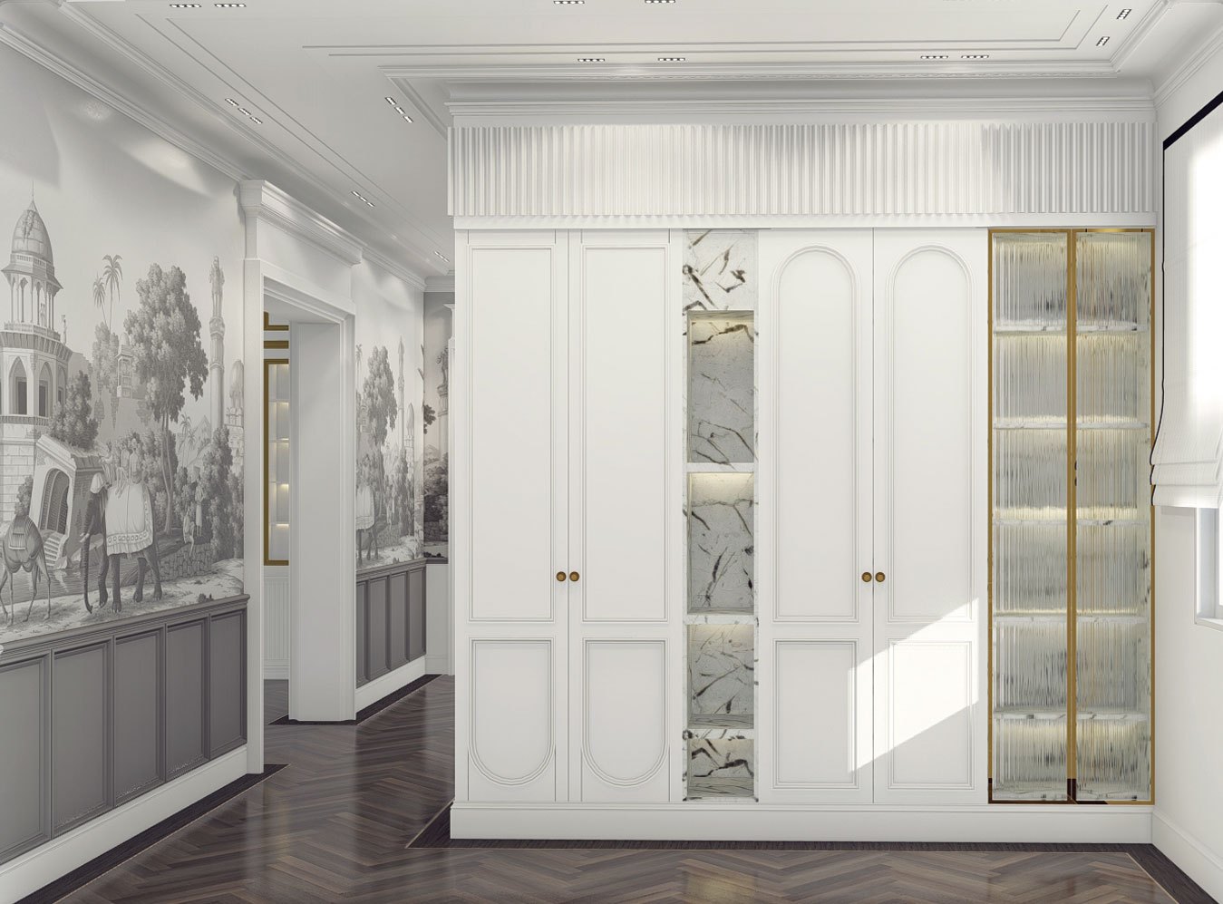 Custom cabinetry plays a central role in defining the spaces. Arched doorways, fluted details, and brass hardware travel back in time to introduce a neoclassical aesthetic, while bespoke storage keeps everything purposeful. Scenic monochrome murals unfold across select walls, adding an artistic touch that feels both historical and unexpected.