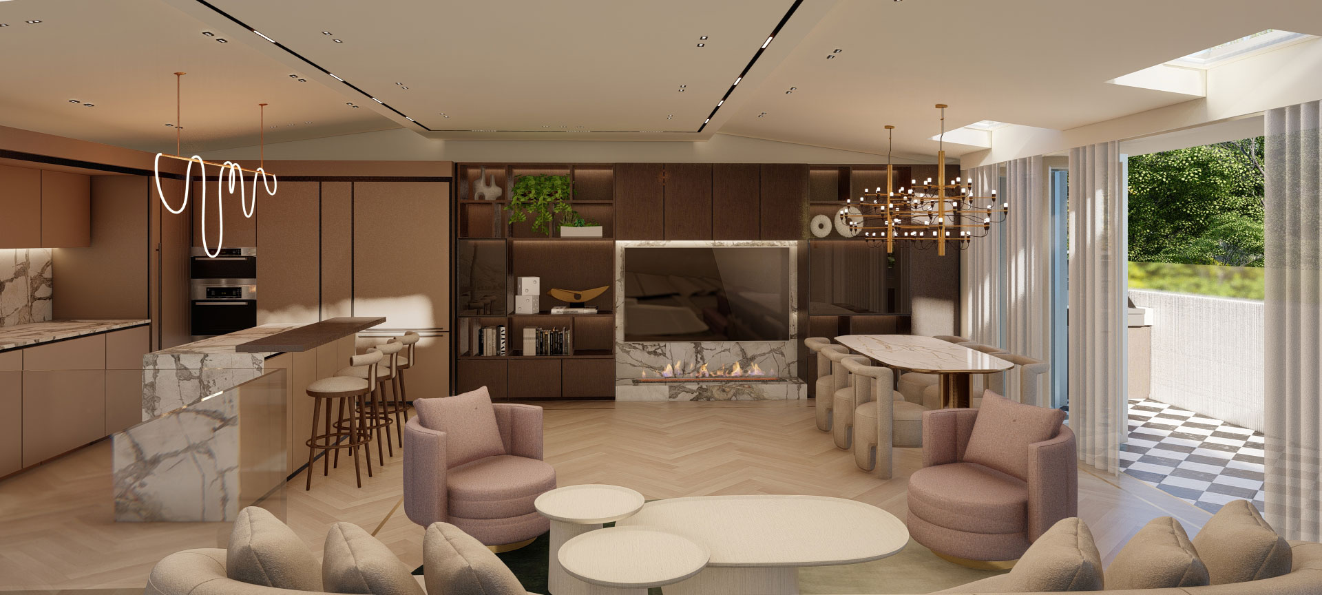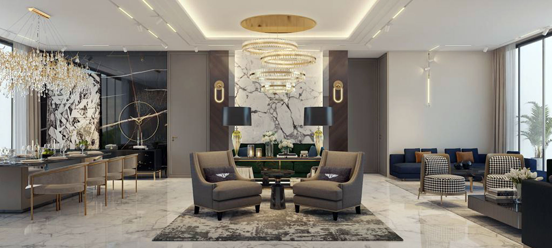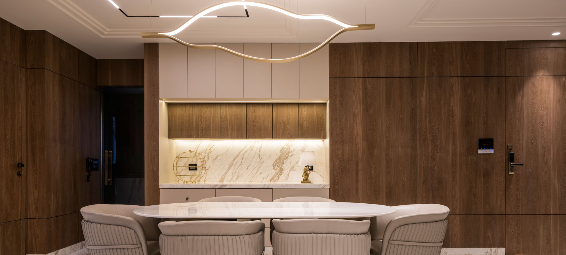 This six-bedroom penthouse sits on a confident edge, where dramatic lighting, rich wood finishes, and bold materials create a setting of bold luxury. Book-matched marble