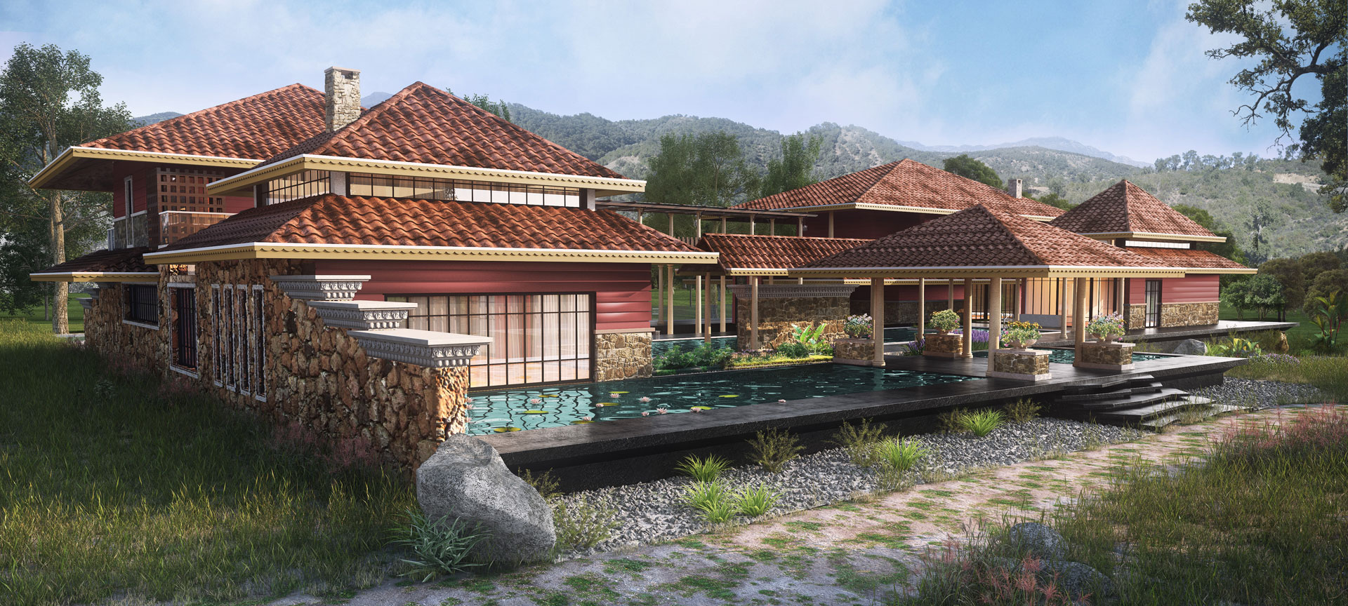 This expansive mountain residence in Dehradun creates a dialogue between vernacular building traditions and modern spatial luxury. Sited along a dramatic ridgeline with captivating mountain