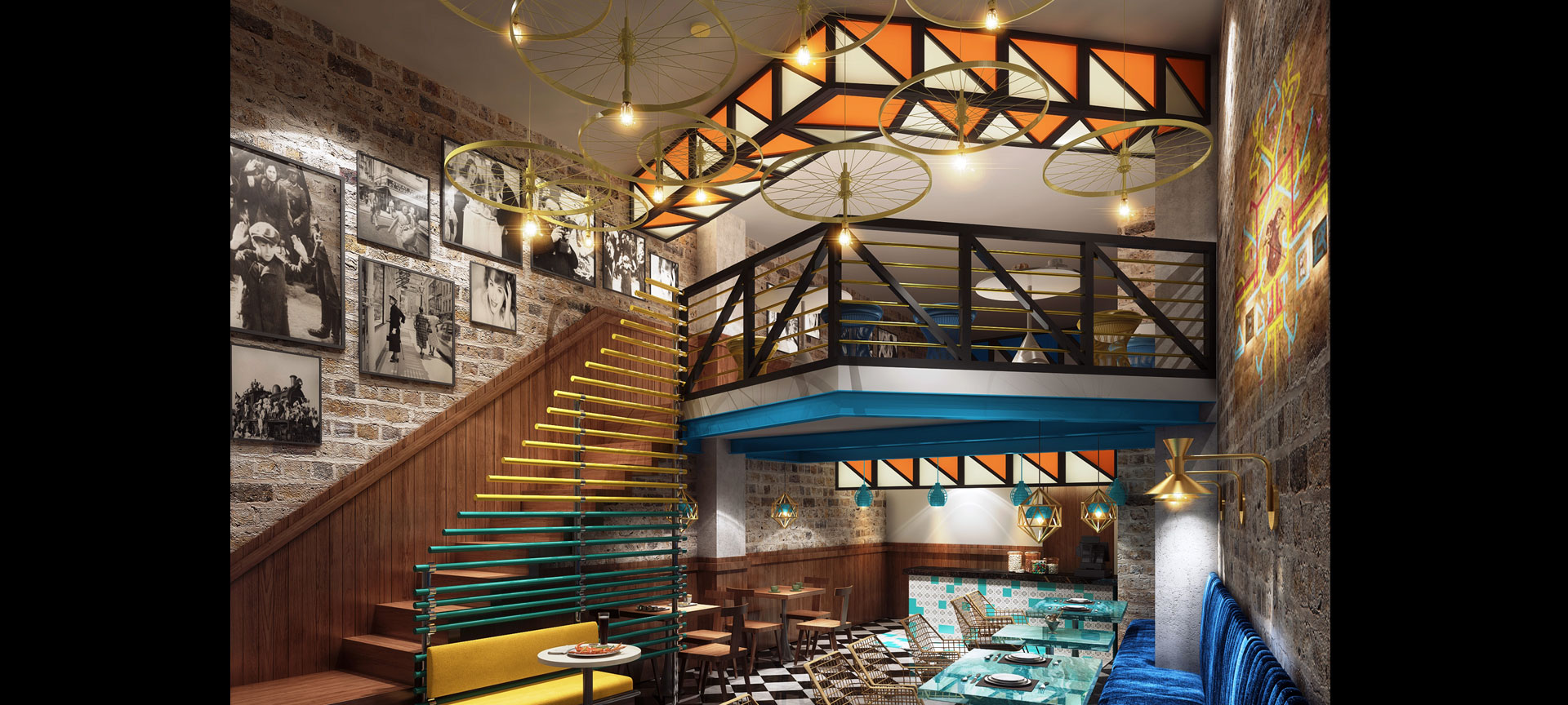 Transforming a challenging narrow footprint into a multi-level dining experience, this restaurant interior expresses bold materiality and strategic spatial layering. The design takes an eclectic