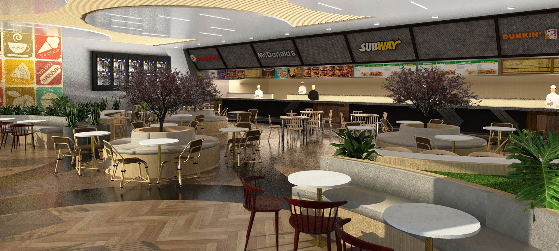 The food and beverage area for Kochi Domestic Terminal, presents airport dining through considered spatial design that prioritizes passenger experience and operational clarity. The project