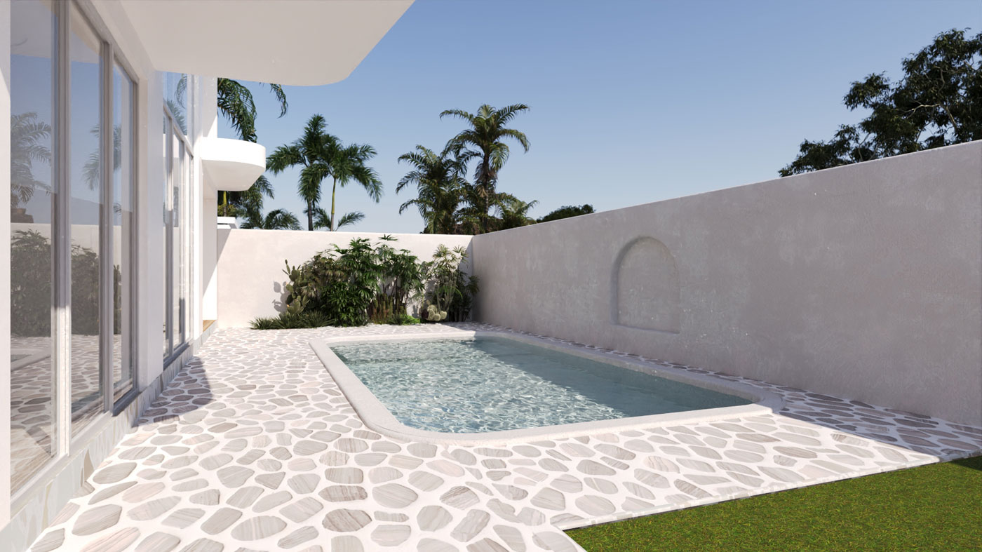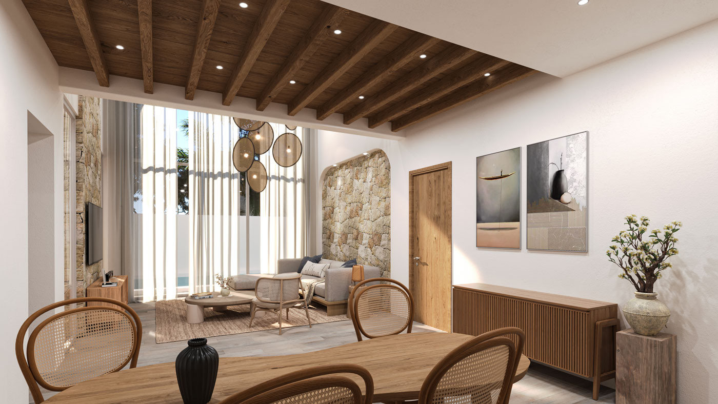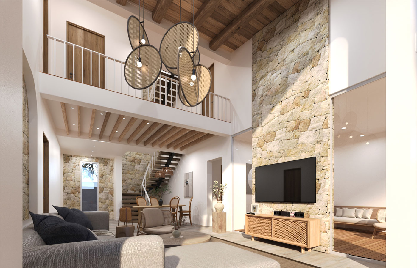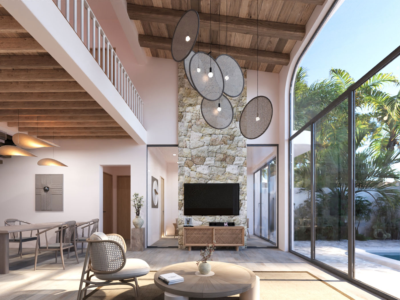 White walls and exposed wood beams maintain a clean aesthetic while stone feature walls bring in raw textures. Double-height living spaces allow air to circulate naturally even during the hottest days. Woven pendant lights and cane furniture reinforce a tropical atmosphere. The pool sits right against the main living areas, separated only by glass doors that disappear when opened. Curved walls create private outdoor spaces while organic paving patterns add visual interest underfoot. Palm trees frame views without blocking light. Inside, the open plan connects living, dining and kitchen areas while the mezzanine level adds sleeping space without walls that would interrupt the flow.