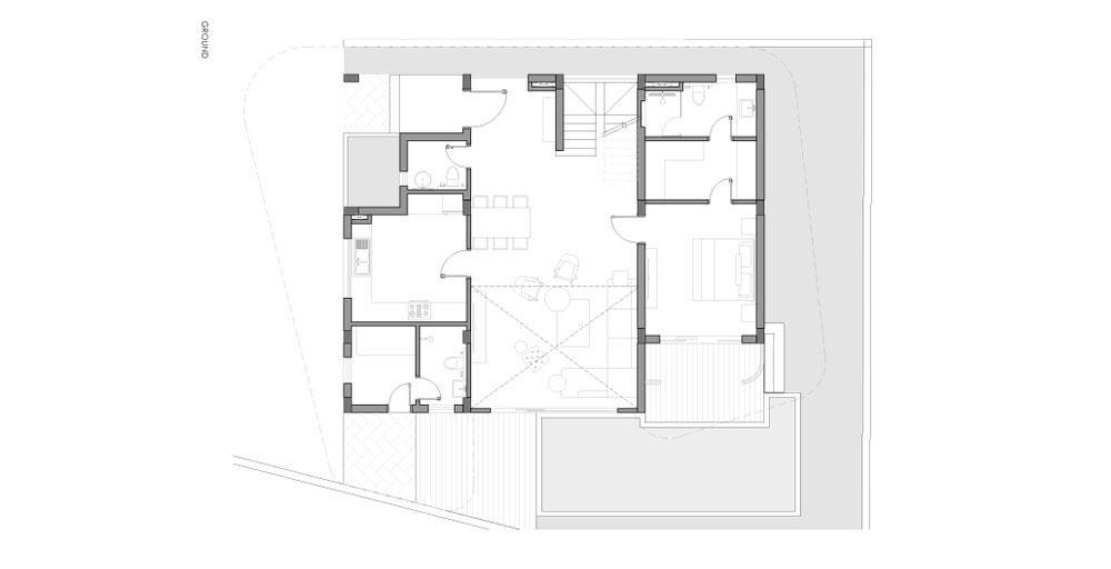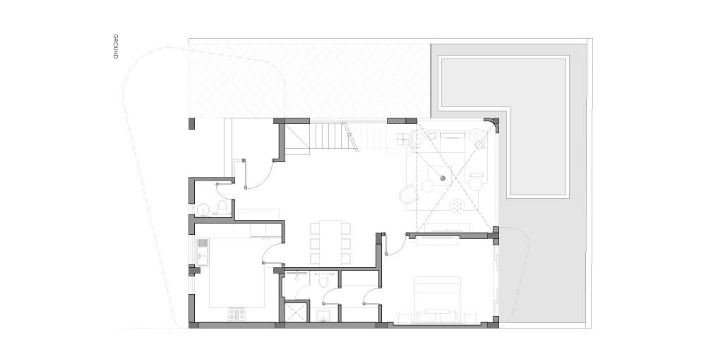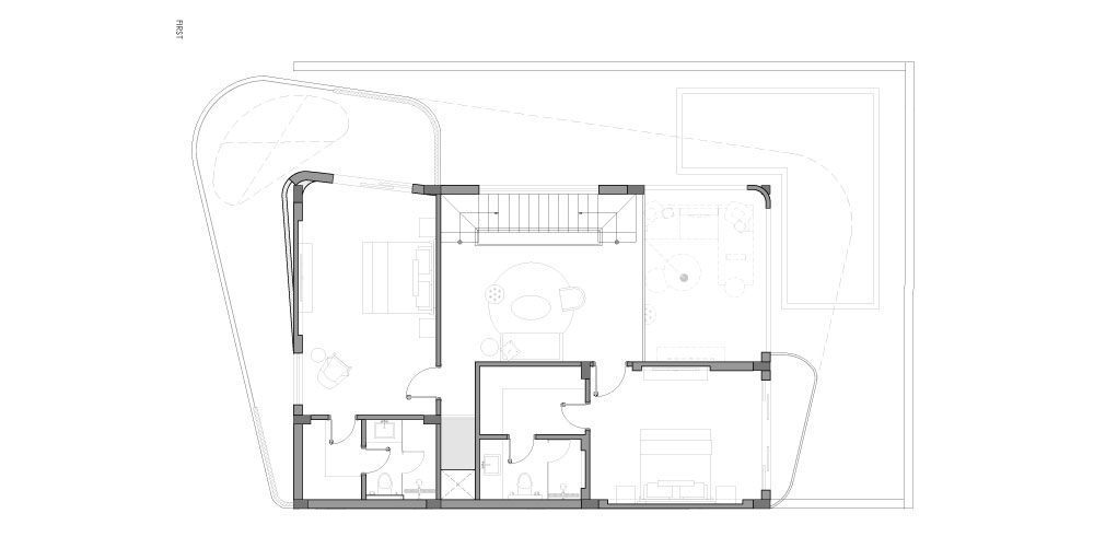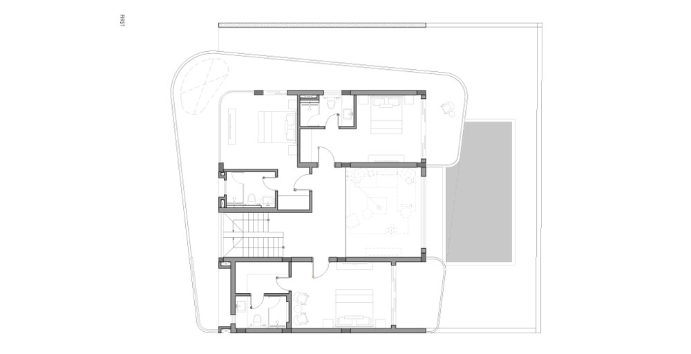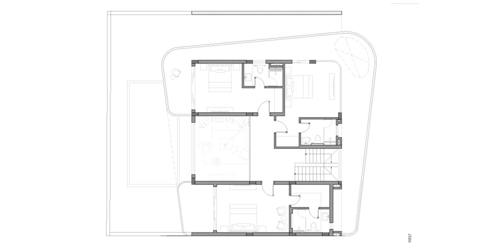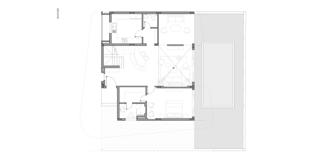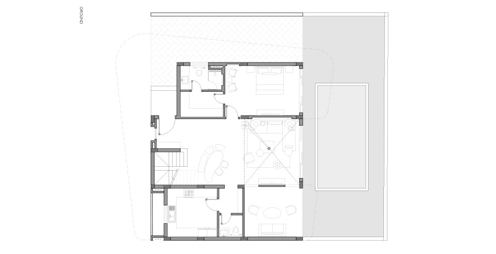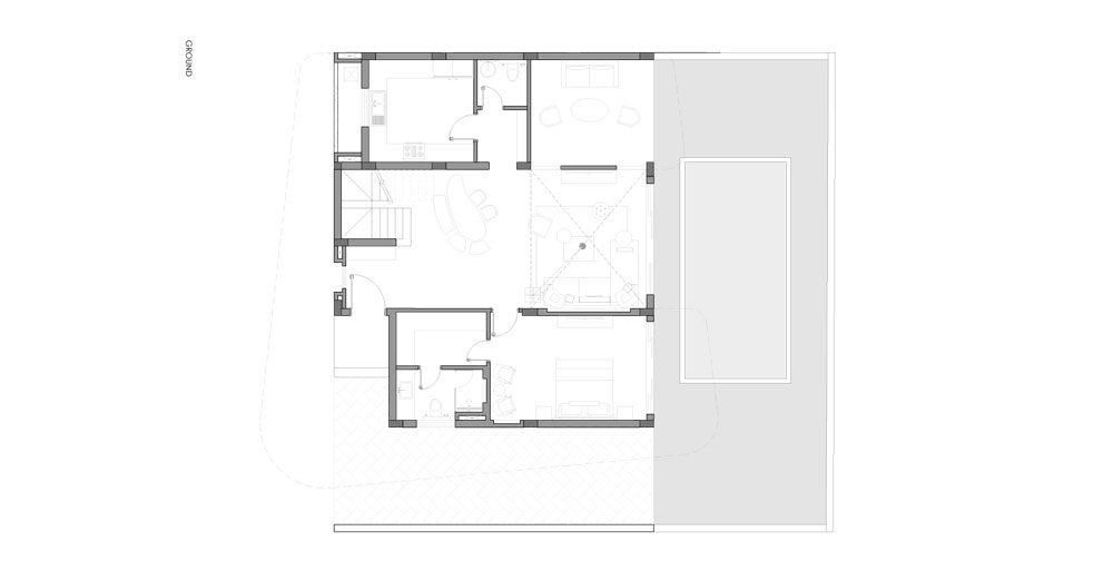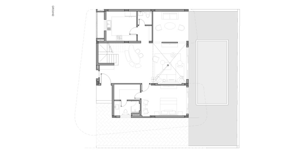 White walls and exposed wood beams maintain a clean aesthetic while stone feature walls bring in raw textures. Double-height living spaces allow air to circulate naturally even during the hottest days. Woven pendant lights and cane furniture reinforce a tropical atmosphere. The pool sits right against the main living areas, separated only by glass doors that disappear when opened. Curved walls create private outdoor spaces while organic paving patterns add visual interest underfoot. Palm trees frame views without blocking light. Inside, the open plan connects living, dining and kitchen areas while the mezzanine level adds sleeping space without walls that would interrupt the flow.