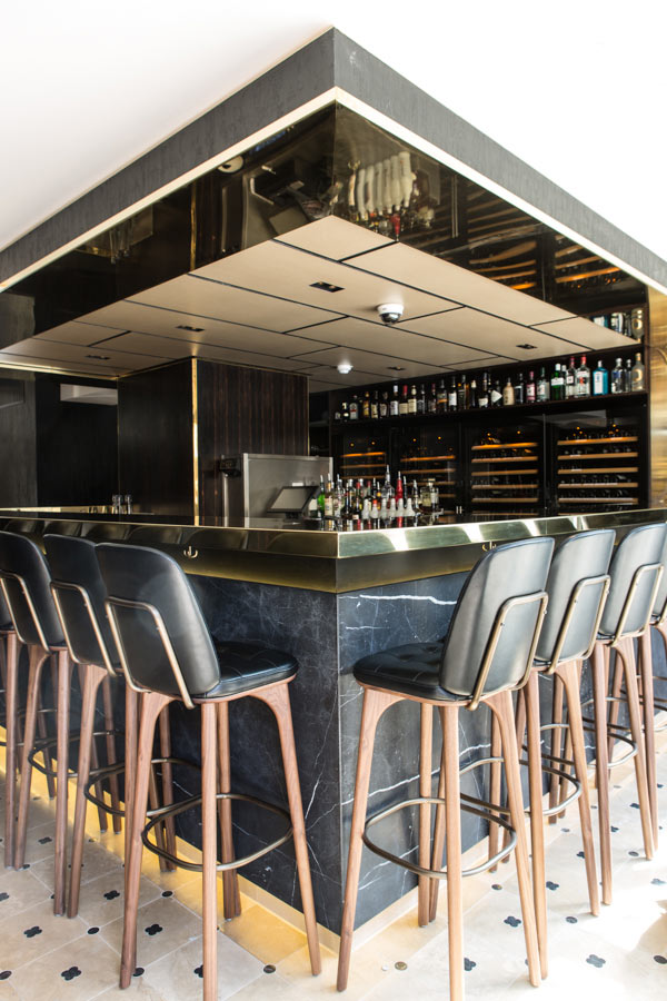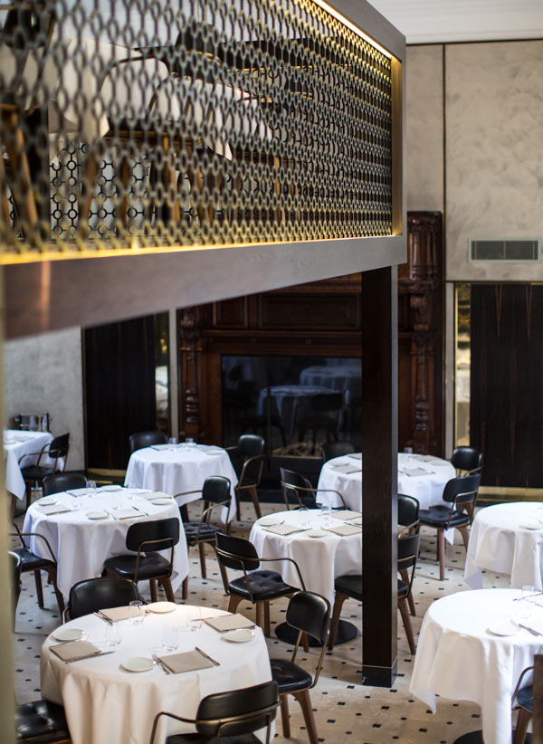 The main dining room holds its drama at the ceiling height. A double-height space with an original ornate fireplace becomes backdrop for custom lighting that drops through the volume, cylindrical fixtures with brass rods extending both up and down. White tablecloths ground the formal ambience while black leather dining chairs with walnut frames keep things from feeling too constrained. The bar area commits fully to moody luxury too as its overhead canopy appears to float. Bar stools in charcoal leather with brass footrests line the counter clad in book-matched dark stone. The mezzanine level wraps around the main dining space, its perforated brass screen allowing views down while maintaining intimacy for diners above.