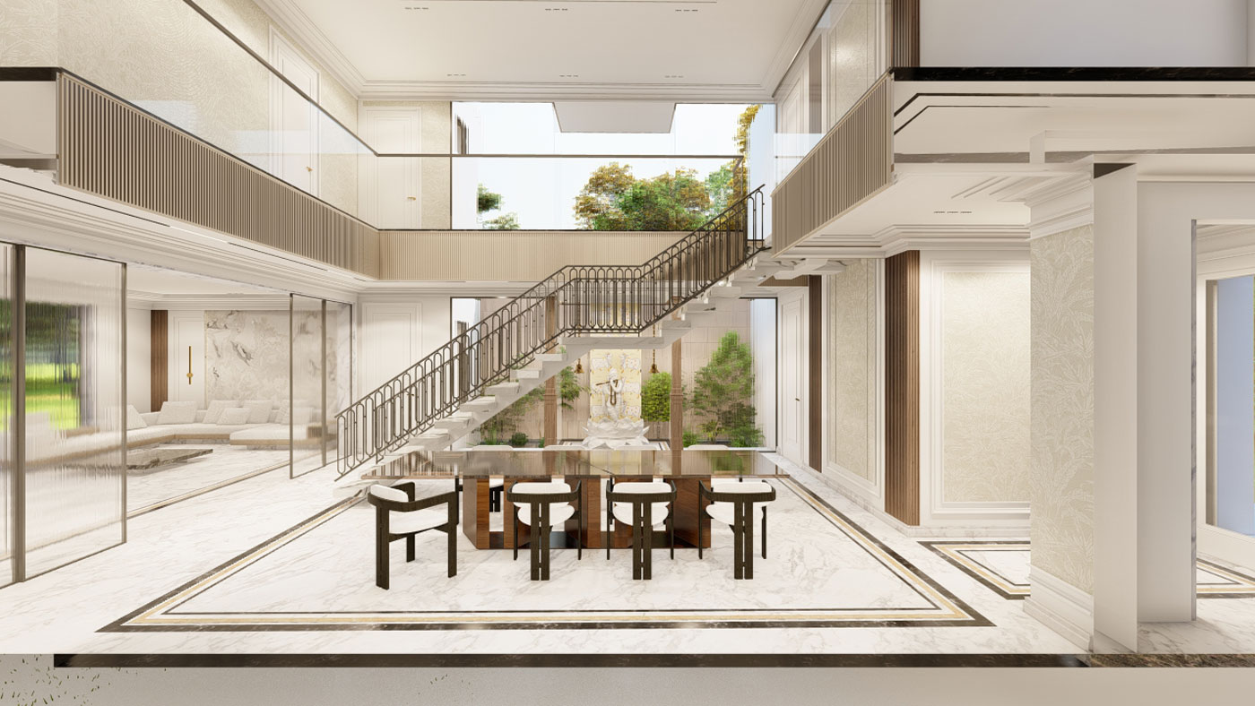 The dining area slips effortlessly into the indoor garden, the glass fading into greenery so that meals can feel like a conversation involving nature. The interiors stay crisp in textured walls and polished marble floors bordered in dark stone. Furniture throughout is bespoke, a sculptural dining and clean lined pieces fit right into the intended design. Every corner finds its room to breathe and make the atmosphere light.