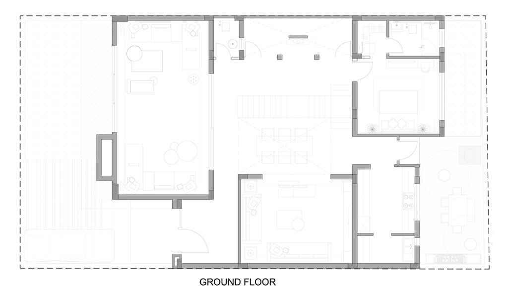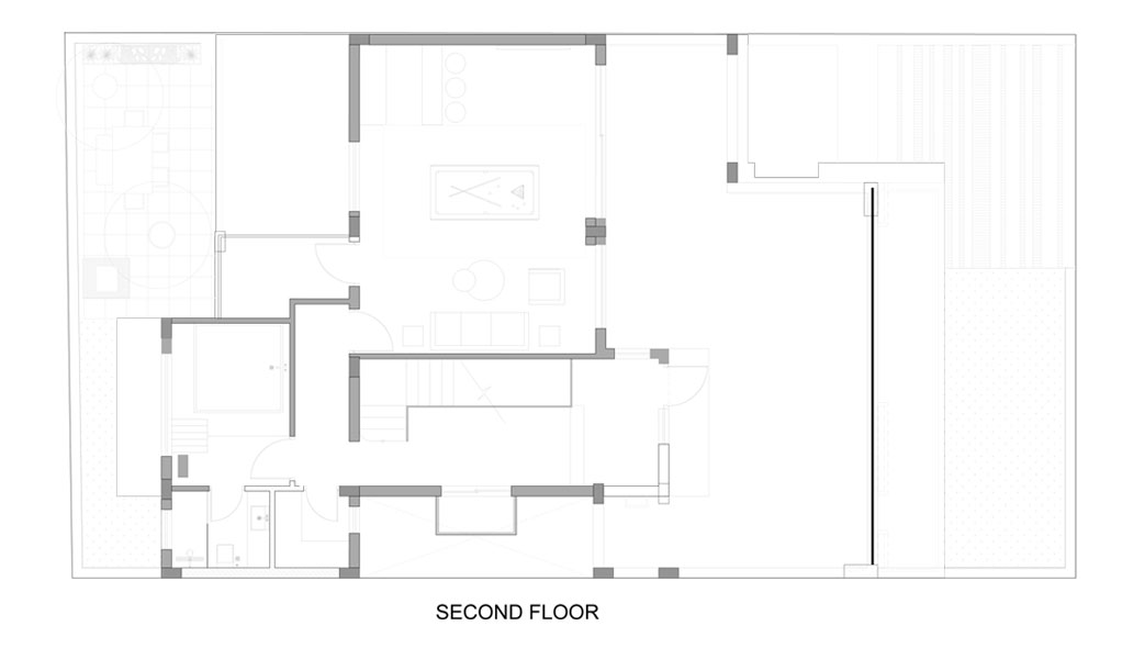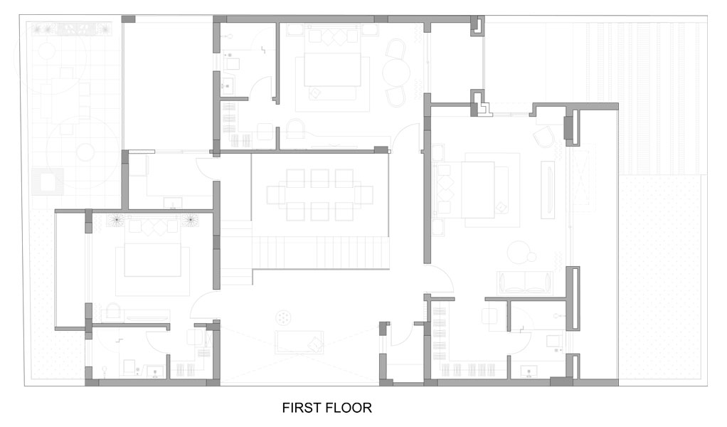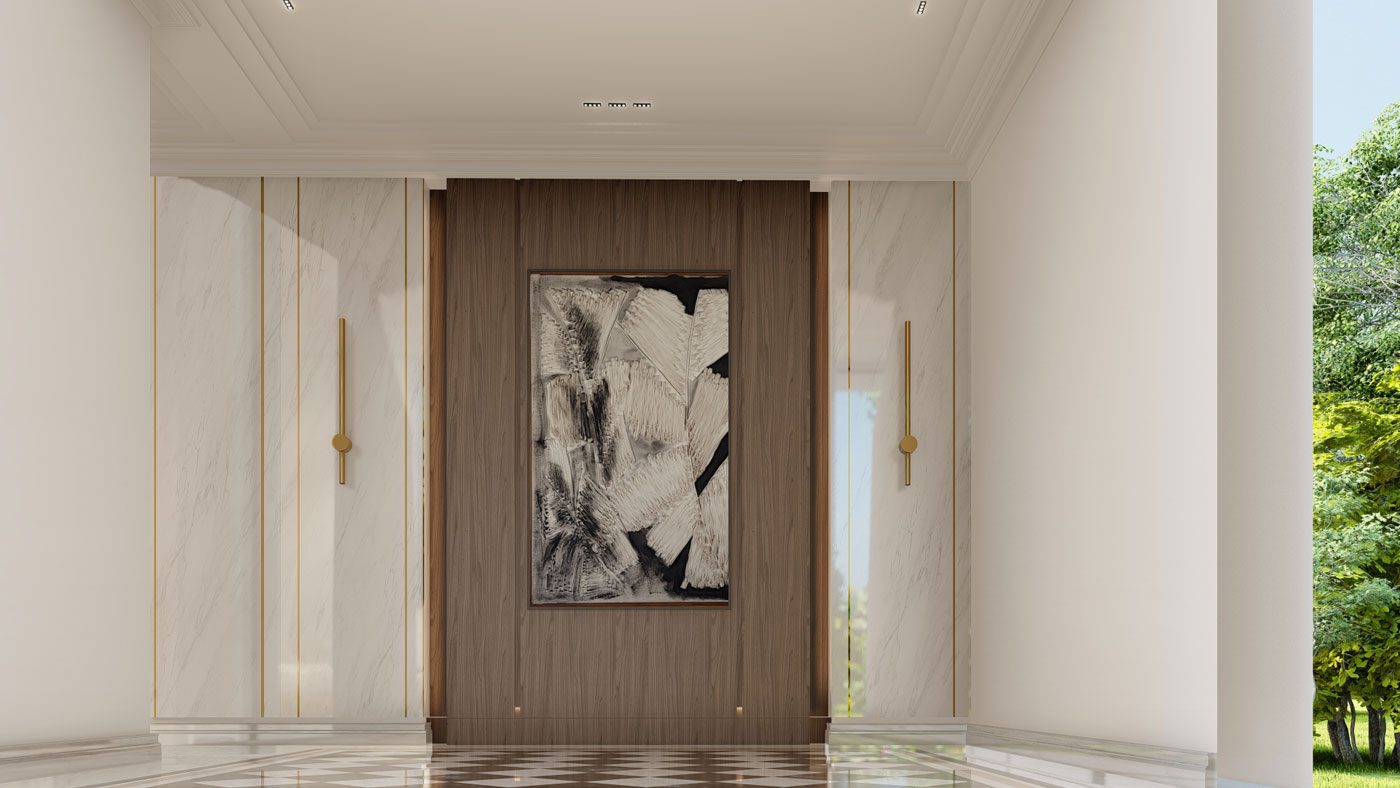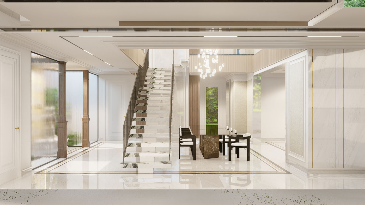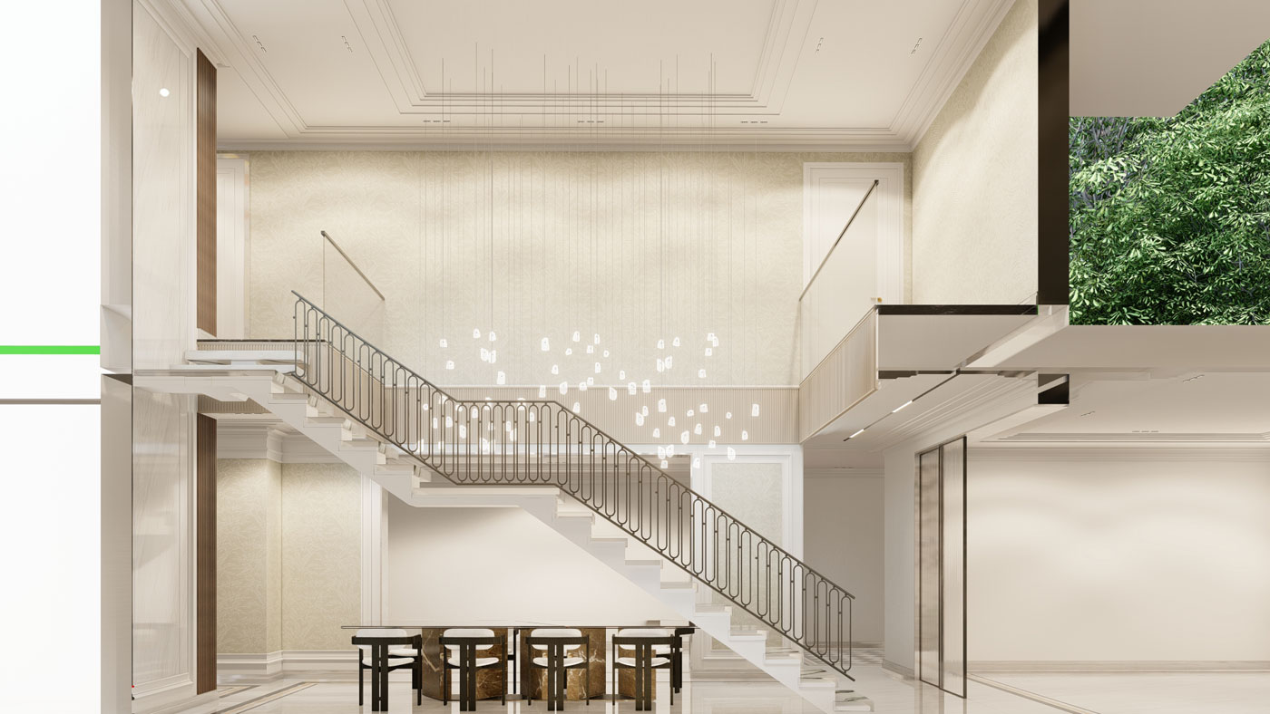 A home that moves with its inhabitants. Open living areas, quiet corners, and double-height volumes unfold naturally, each space though deliberately designed feels at ease. Light spills in through tall windows brushing across white walls and warm wood. Rooms open into each other in a way that feels unplanned yet completely right, with a floating staircase cutting through a double-height volume like a quiet sculpture. A cascading chandelier drops through this void adding a theatrical moment in an otherwise composed spaces.